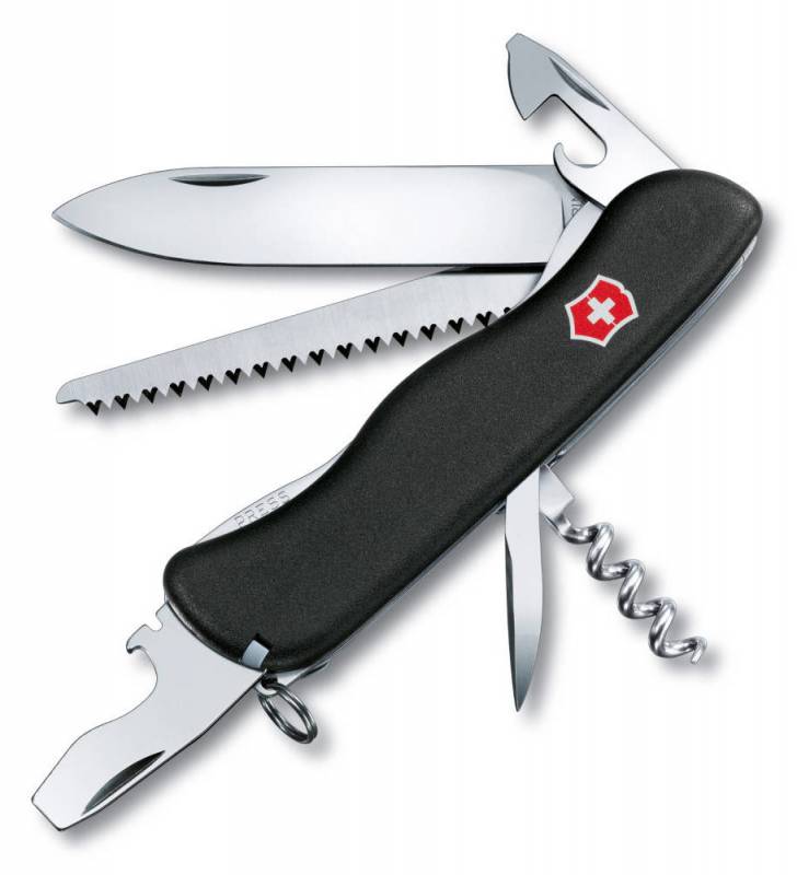 Нож для спецслужб с фиксатором FORESTER - это многофункциональный инструмент с рукояткой из черного нейлона и с набором из 12 функций: