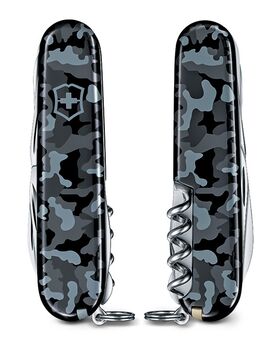 Список функций большое лезвие, малое лезвие, штопор, шило,кернер, многофункциональный крючок, нож для открывания консервов с малой отверткой, комбинированный инструмент с открывалкой для бутылок с плоской отверткой, инструментом для снятия изоляции, кольцо для подвеса, пинцет, зубочистка, ножницы, пила по дереву