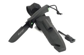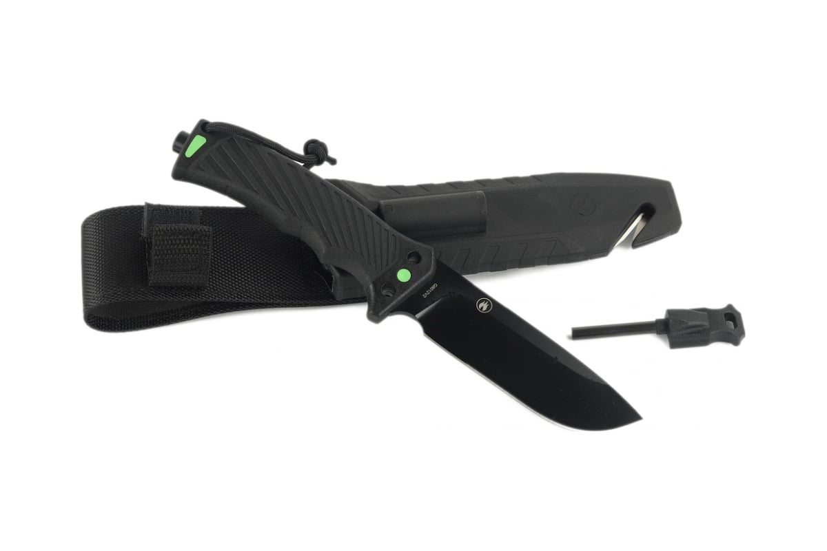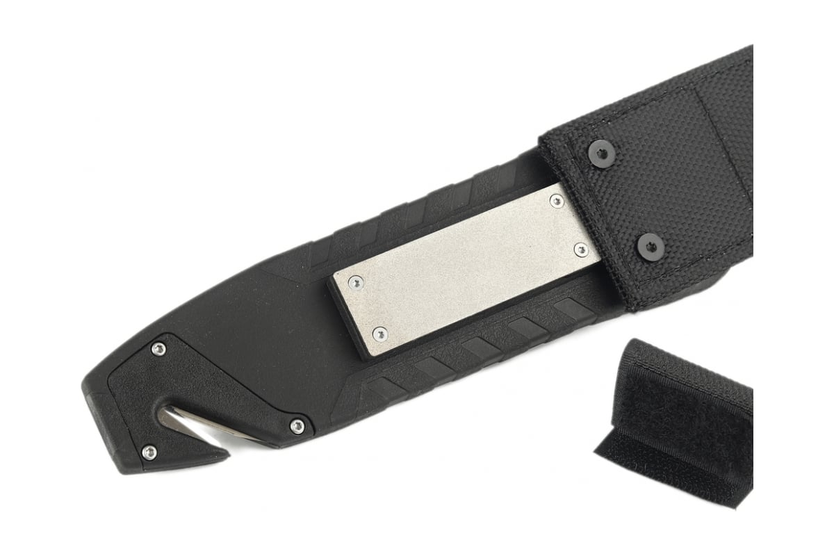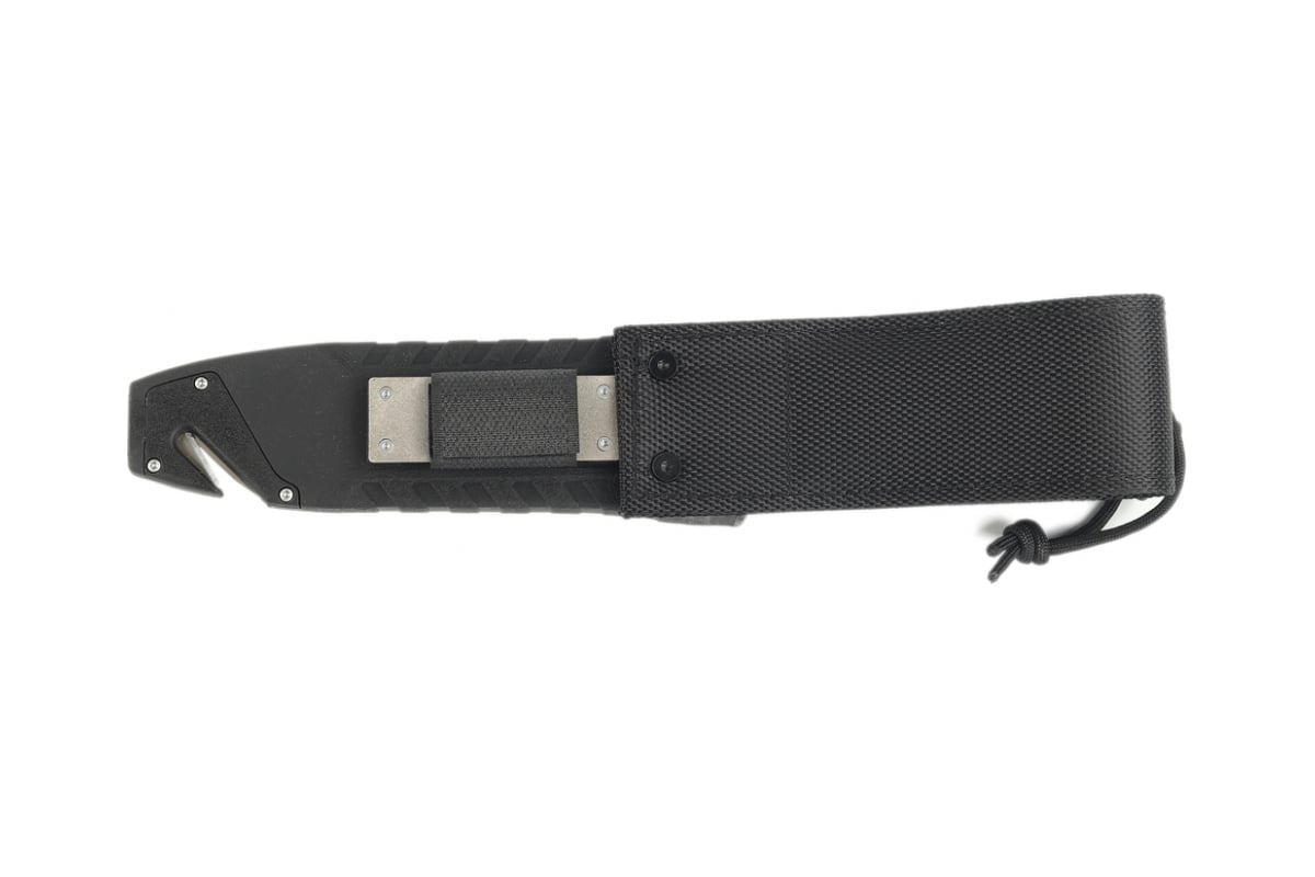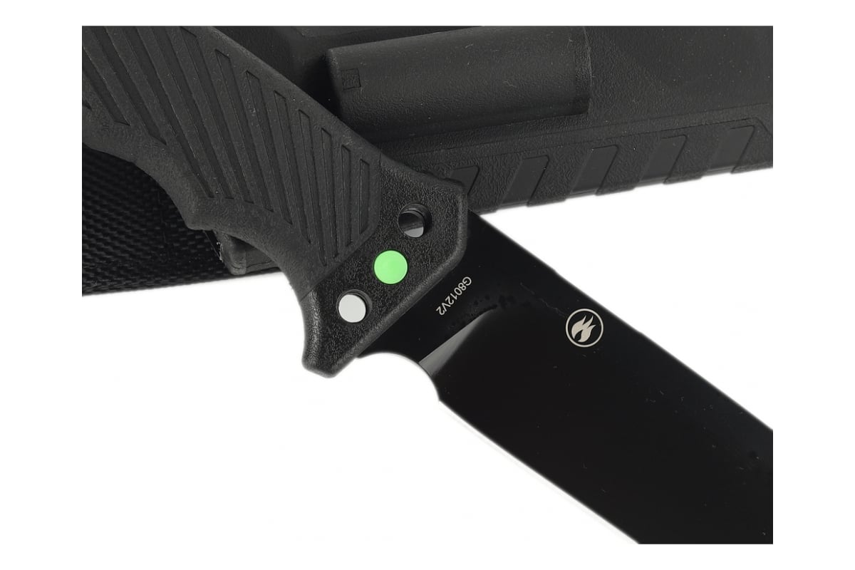 Нож идет в комплекте с фирменными ножнами, которые изготовлены из ударопрочного пластика и нейлона.
