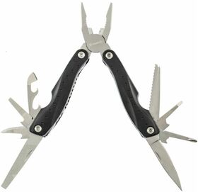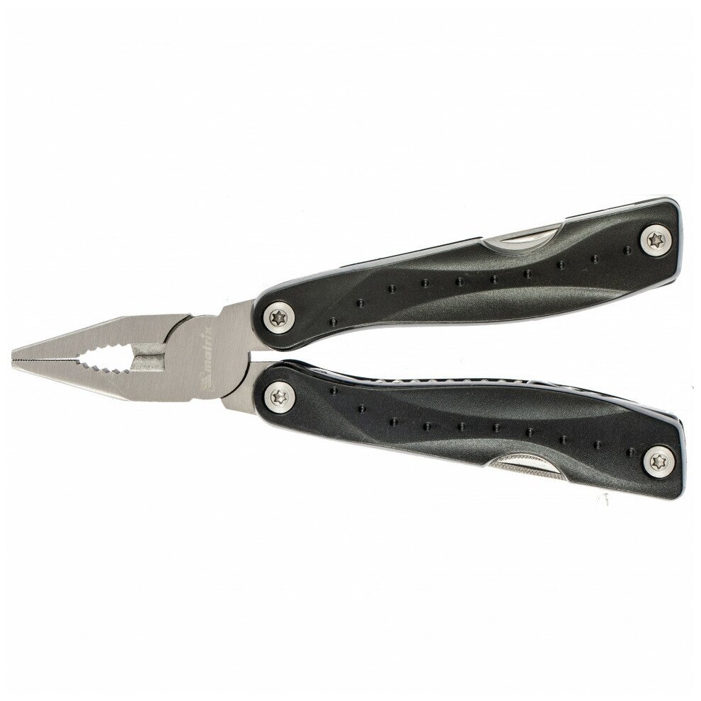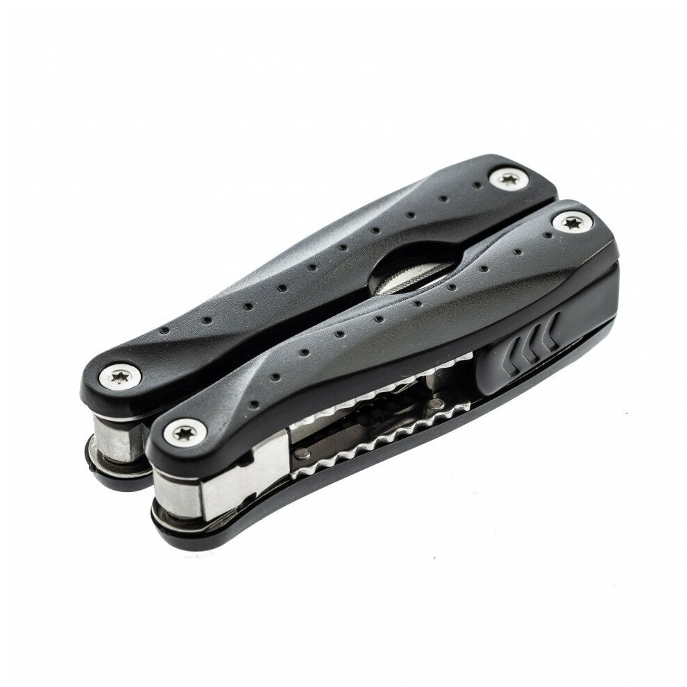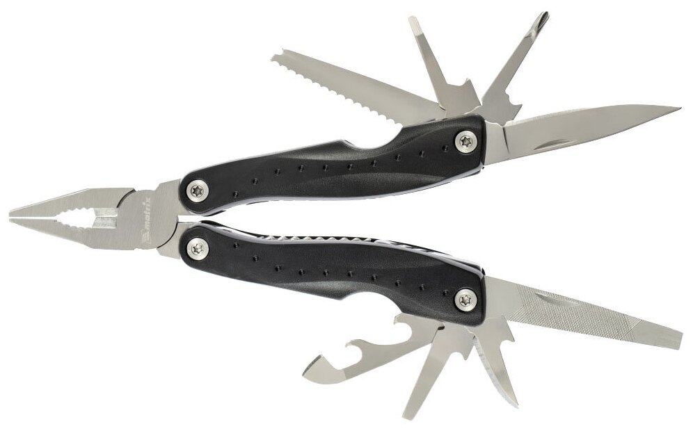 длинногубцы, захват для удерживания полукруглых предметов, кусачки, нож, линейка, консервный нож, пилка для ногтей двусторонняя, пила, открывалка для бутылок, крестовая отвертка, три плоские отвертки (большая, средняя, малая)