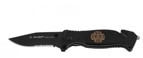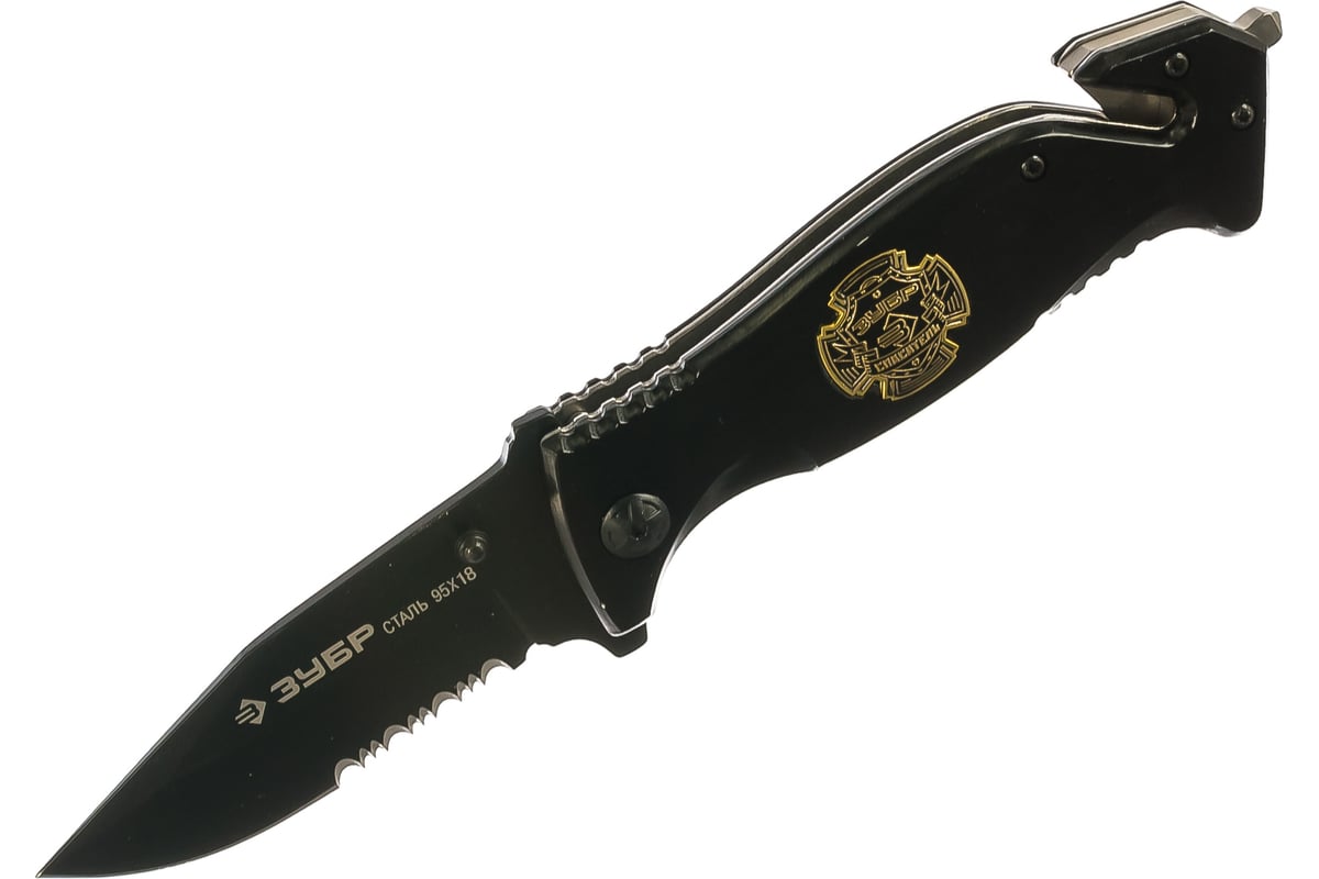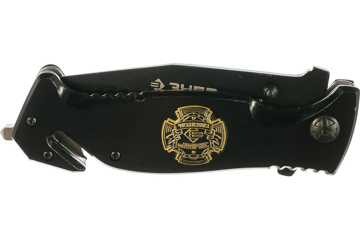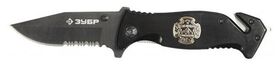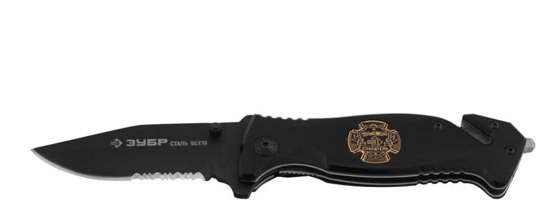 Складной нож, серрейтор. заточка, наконечник для стекол, резак,200мм/лезвие 90мм Зубр "ЭКСПЕРТ" СПАСАТЕЛЬ 47707_z01 позволяет при необходимости быстро выбраться из автомобиля с заблокированными дверями: