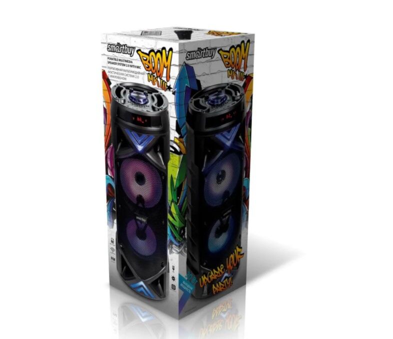 Smartbuy BOOM MK III один из флагманов линейки портативной акустики Smartbuy! Полный набор функций: Bluetooth, AUX, FM, MP3-плеер. Телескопическая антенна. LED-экран. Подсветка. Пульт ДУ. Микрофон для караоке. Характеристики: FM приемник Эквалайзер (POP, Rock, Jazz) 8 часов воспроизведение без подзарядки (аккумулятор 4500мАч) Микрофон в комплекте LED-подсветка Мощность: 2х15W Частота: 45Hz - 18KHz Возможно загрузить приложение для управления с телефона. Архитектура 2.0 Мощность: 30 Вт Диаметр динамиков: 2х165 мм Материал корпуса: металл, пластик