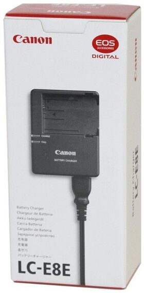Зарядное устройство для аккумулятора Canon LP-E8, работает от сети, показывает уровень заряда индикатором. Для фотоаппаратов EOS 550D, EOS 600D, EOS 650D, EOS 700D.