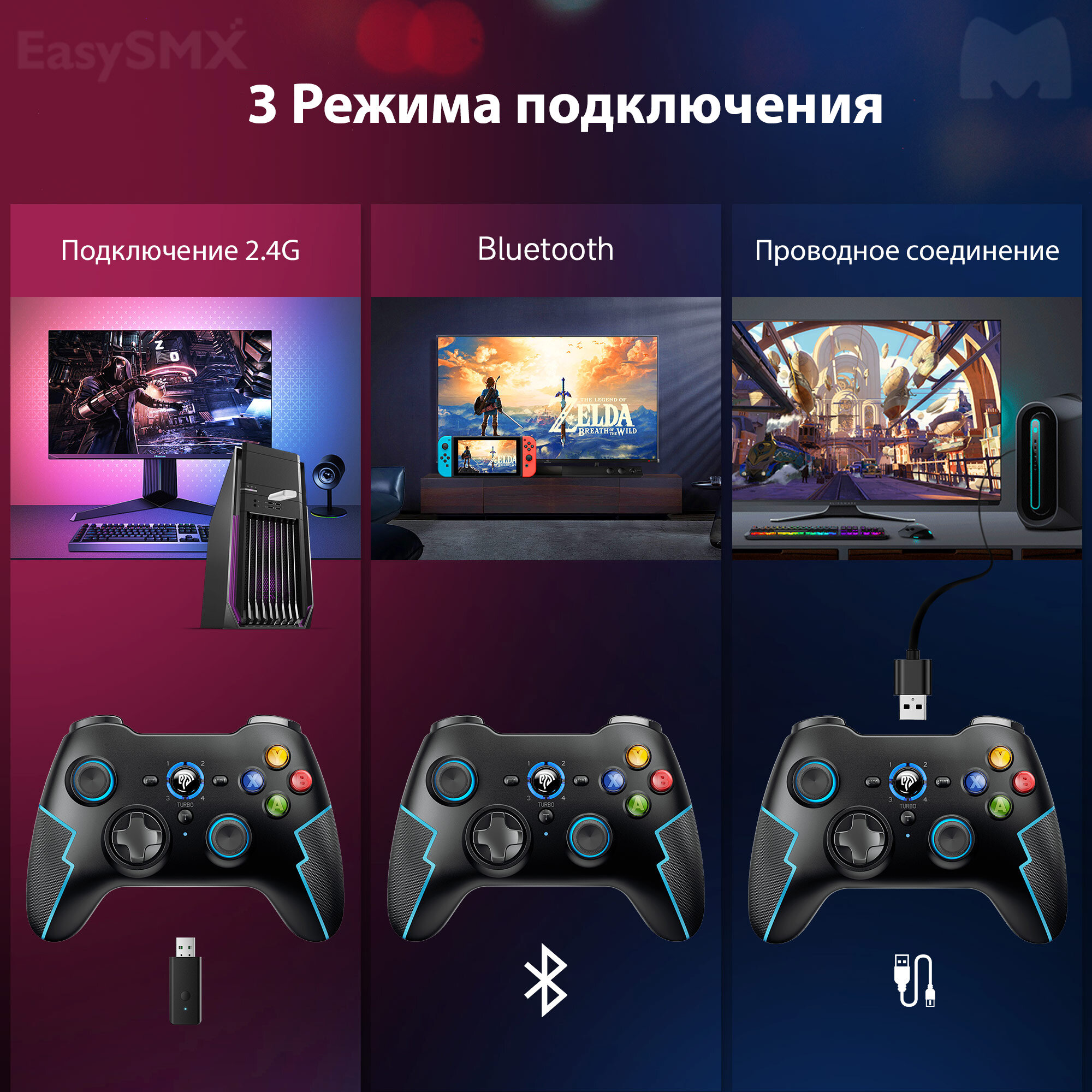 Беспроводной игровой геймпад с возможностью проводного USB-C подключения к PC/PS3 или подключения по беспроводной связи 2,4Ггц или Bluetooth к PC, Steam Deck, смартфонах на iOS/Android, Nintendo.