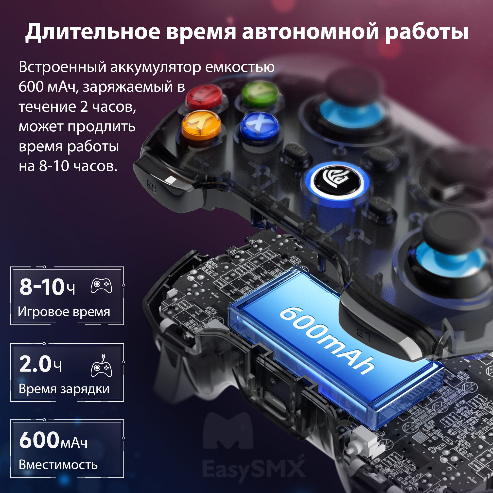 Обновленная литиевая батарея игрового контроллера 9013Pro емкостью 600 мАч может обеспечить до 8-10 часов игрового времени, поэтому вам не нужно беспокоиться о разряде батареи во время интенсивной игры.