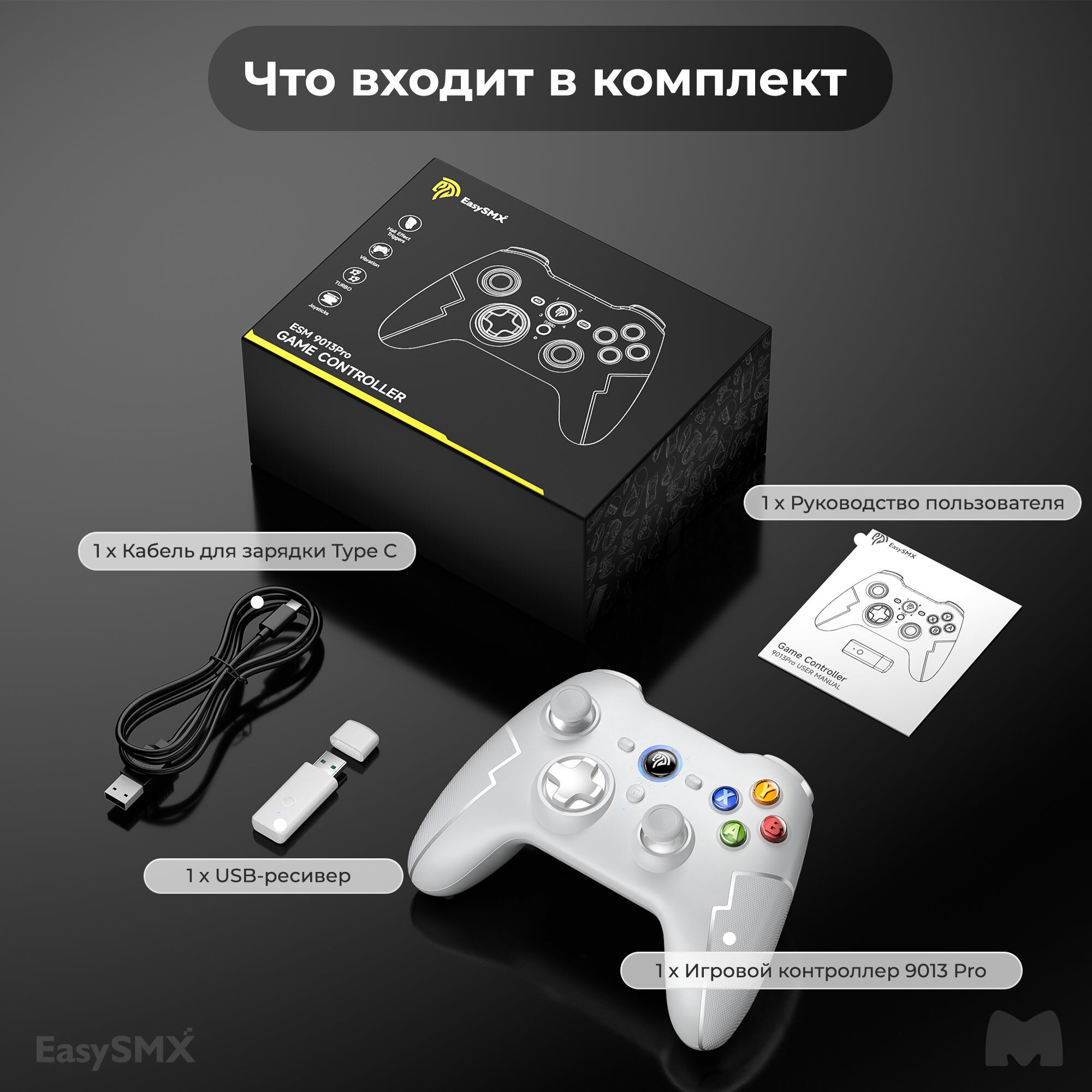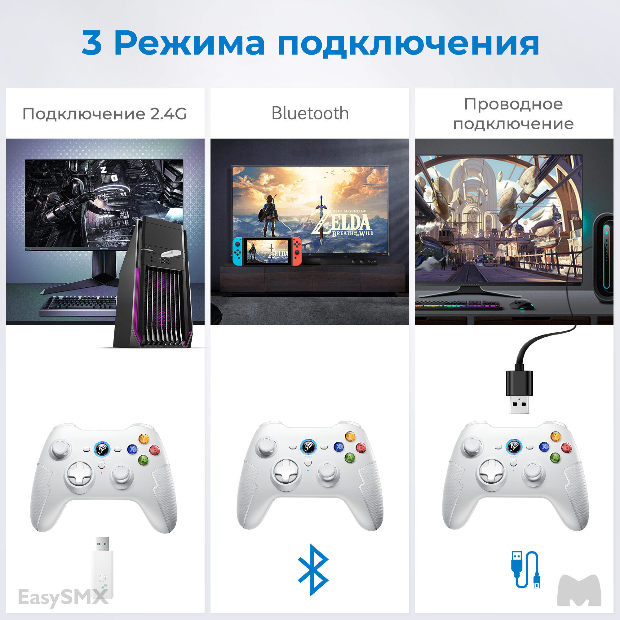 Беспроводной игровой геймпад с возможностью проводного USB-C подключения к PC/PS3 или подключения по беспроводной связи 2,4Ггц или Bluetooth к PC, Steam Deck, смартфонах на iOS/Android, Nintendo.