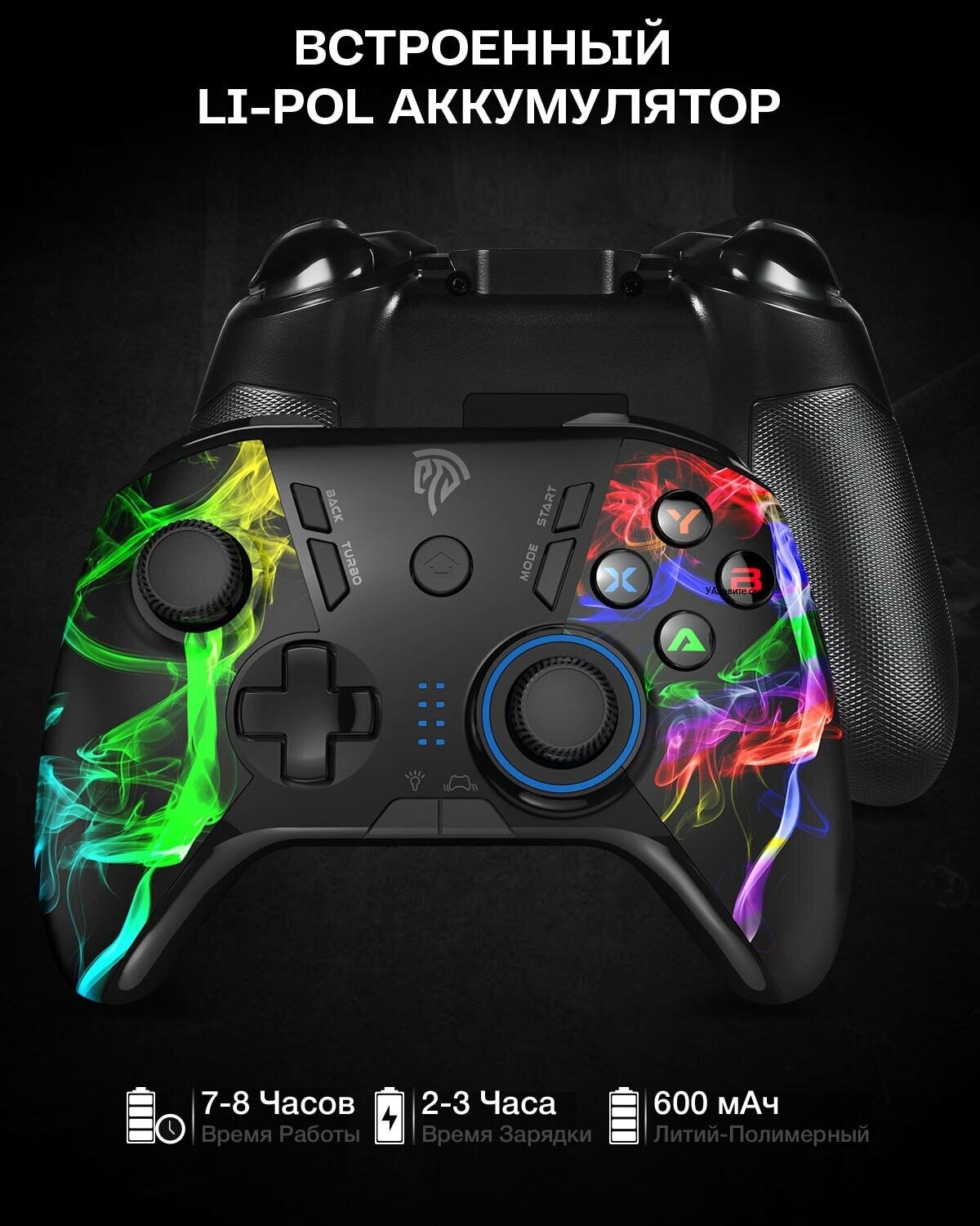 Аккумулятора 600 мАч хватит минимум на 8 часов непрерывной игры (а при отключенной подсветке еще больше) и при необходимости вы можете подзаряжать геймпад по проводу из комплекта, не прерывая игровую сессию. Время полной подзарядки до 2 часов.