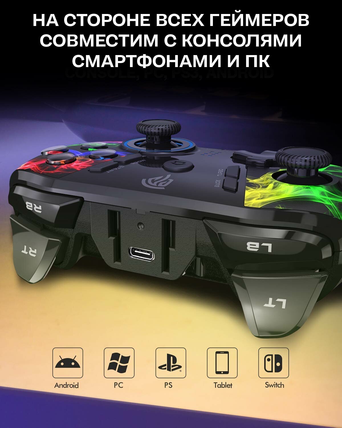 Игровой геймпад с возможностью проводного USB-C подключения или подключения по беспроводной связи 2,4 ГГц для ПК, PS3, смартфона, планшета или ТВ приставки на Android, а также для Nintendo Switch (по кабелю).