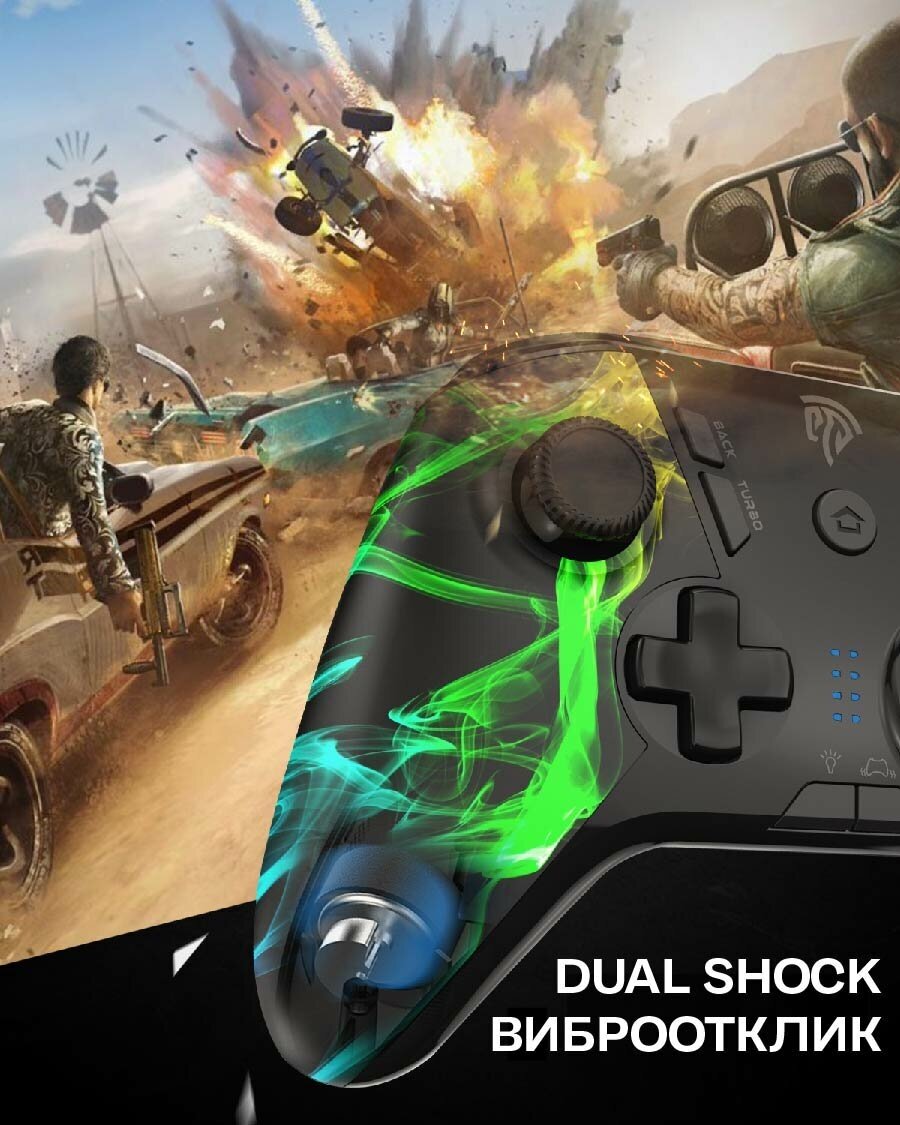 Геймпад имеет встроенные асимметричные двигатели с двойной вибрацией и пятью уровнями регулируемой интенсивности, дающие глубокое погружение в игру и позволяющие почувствовать столкновения, тряску, стрельбу от экшн сцен игры или давящее чувство атмосферы и ужаса хорроров.