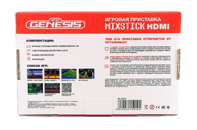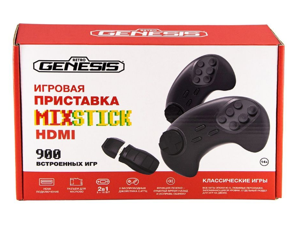 HDMI Игровая приставка Retro Genesis MixStick с HD изображением, беспроводными джойстиками, современным интерфейсом и уникальной функцией. Подключается к разъему HDMI телевизора или монитора. Для особо тонких телевизоров, где пространство у задней панели ограничено, в комплекте поставляется удлинитель HDMI. Игровая приставка серии Fusion, в которой присутствует расширенный функционал привычных игровых ретроприставок. Два беспроводных джойстика имеют две дополнительные кнопки: кнопку выхода в основное меню и кнопку Rewind для перемотки игрового процесса на 7 секунд в прошлое. Подключение к ТВ осуществляется через HDMI разъем. Кабелем USB приставку можно запитать как от сети питания, или, что удобнее - подключить ее к разъему USB самого телевизора. Дополнительной розетки 220В при этом не требуется - питания от порта USB ТВ достаточно. Преимущества: Серия Fusion 900 встроенных игр 8 и 16 бит, разбитых по разделам. Беспроводные джойстики 2,4 ГГц. HDMI подключение Поддержка карт памяти microSD Возможность записи игр пользователя на карту памяти microSD. Два в одном: 8 + 16 Bit Функция REWIND - отмотай время назад и исправь ошибку! Дружелюбное интуитивно понятное меню с дополнительными уникальными разделами, интересными потребителю: -ЛУЧШИЕ ИГРЫ ЭПОХИ Любимые игры миллионов, собранные в одном разделе, без разделения на битность консоли - Марио, Соник, Танчики, Батлтодс и многие другие. -ЛУЧШИЕ ИГРЫ НА ДВОИХ Раздел содержит все самые любимые игры на двух игроков. Теперь не нужно искать среди длинного списка нужную игру и вспоминать ее название, чтобы сыграть в приставку вдвоем. Для этого достаточно зайти в раздел и любимая игра на двух игроков почти точно будет среди них. -16 Bit / 8 Bit Разделы с играми, не вошедшие в первые два раздела. -MicroSD Раздел запуска игр пользователя, закаченные на карту памяти microSD. ФУНКЦИЯ REWIND Эта функция, о которой мечтал каждый владелец игровой приставки в 90-х. В любой игре, независимо от того, встроенная ли это игра, или запущенная пользователем с SD-карты памяти, процессор записывает все события, произошедшие в последние 7 секунд игрового процесса. При нажатии на кнопку REWIND, игровой процесс моментально проматывается назад, а пользователь может не просто начать играть с этого момента, но и последовательно выбрать момент времени, с которого он хочет совершить действие опять. Несмотря на то, что описание выглядит сложно, на практике все происходит на интуитивном уровне: напоролись на врага, который отнял у вашего персонажа жизнь? Нажали кнопку REWIND и время отмоталось на 7 секунд назад. Дальше можно нажать на кнопку A и продолжить с этого же места, или кнопками направления вправо-влево выбрать подходящий кадр в течение этих 7 секунд и попробовать совершить действие опять. С такой функцией даже неопытный игрок может пройти любую игру и посмотреть концовку, о которой в обычных условиях он не мог и мечтать. REWIND - функция удобнее, чем сохранения! Преимущества: Полноценное воспроизведение игр на 60 кадрах в секунду за счет использования аналога оригинального железа классических приставок - никаких эмуляторов. Система два в одном: игры SMD и NES. Разъем microSD, с помощью которого можно запускать собственные игры 16 Bit с карты памяти. Положите игры в папку ROMS, расположенную в корне подключаемой microSD. 900 встроенных игрДва беспроводных 2,4ГГц джойстика в комплекте.Комплектация: Игровая прист