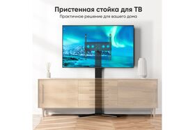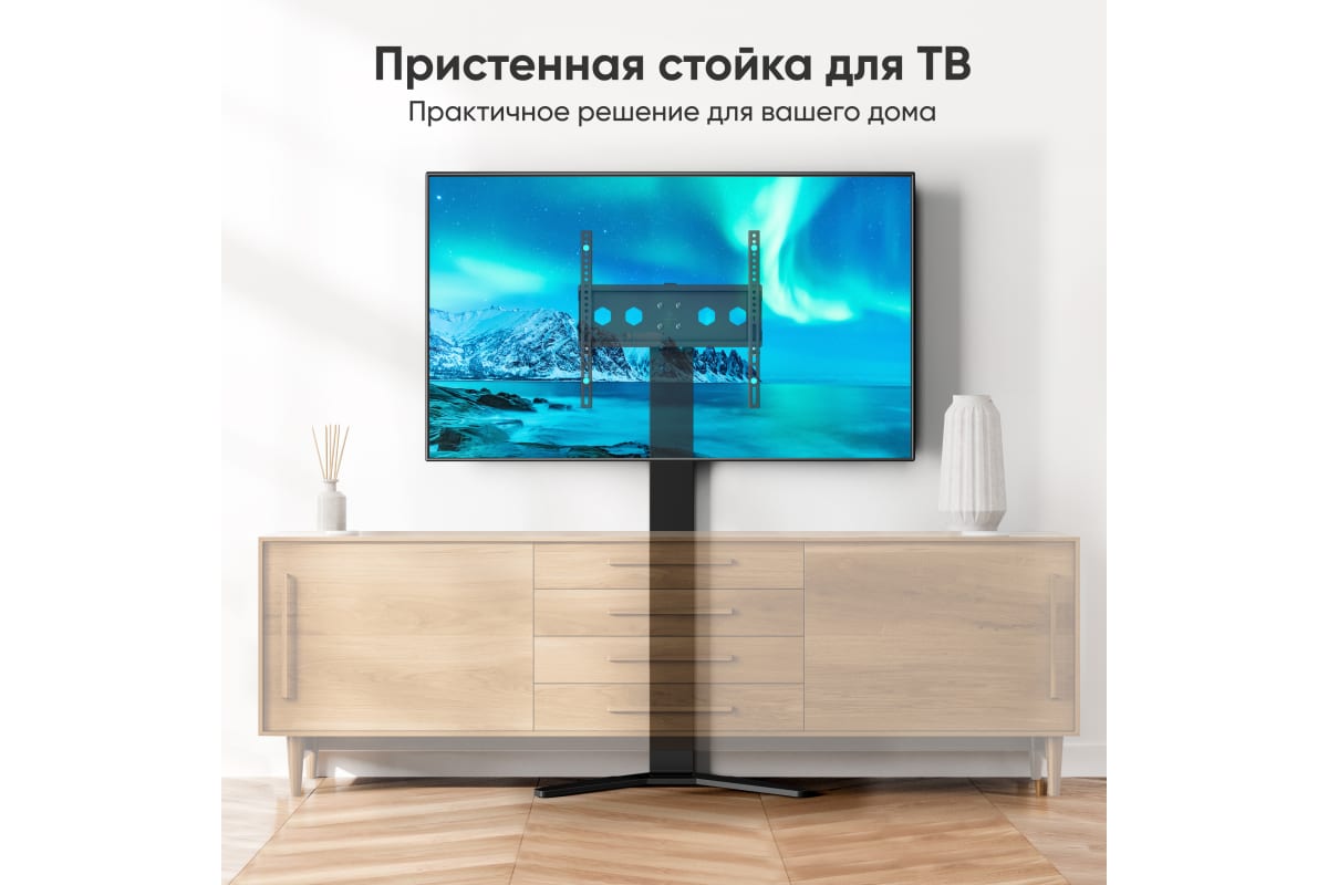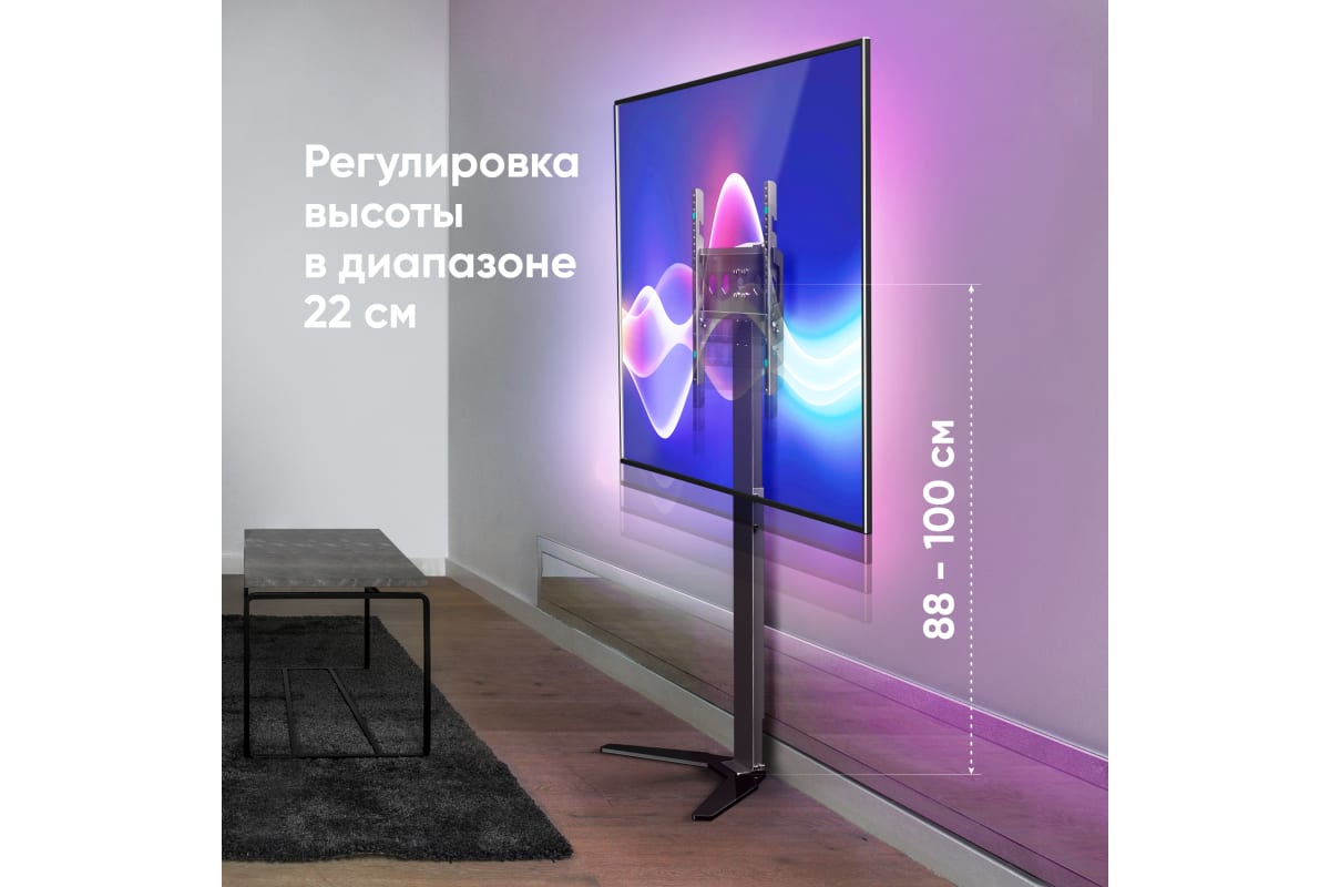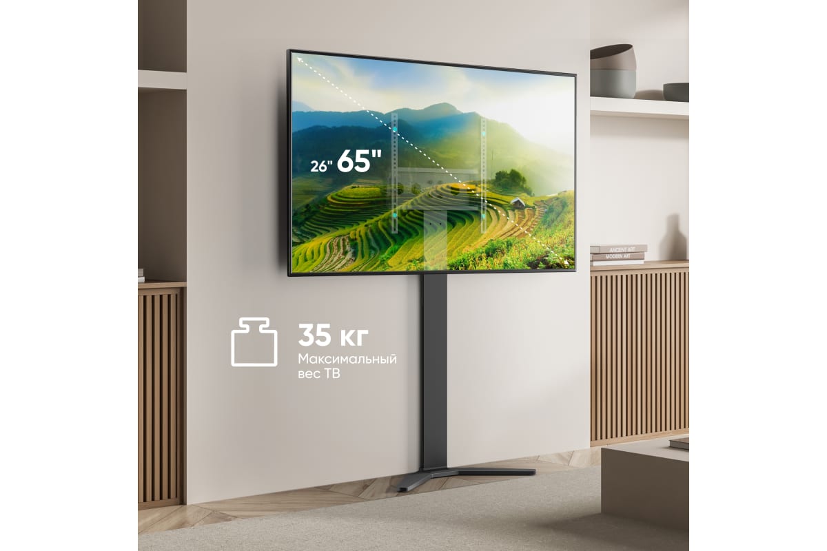 Основную нагрузку от телевизора принимает на себя мощное основание, которое позволяет размещать экраны диагональю от 26 до 65 дюймов , весом до 35 кг . Прочная и надёжная база придаёт стойке дополнительную устойчивость, вам не нужно будет беспокоиться о том, что ТВ опрокинется. Благодаря узкой колонне стойку с телевизором можно поставит ь за тумбой – это сэкономит вам место и позволит преобразить окружающее пространств о, так как стойка будет смотреться выигрышно в любом интерьере . Стойка под телевизор является отличной альтернативой фиксированному настенному кронштейну, но при этом облада ет опцией корректировки высоты, настраивать которую можно двумя способами: перестановкой направляющих либо перемещением VESA - панели.