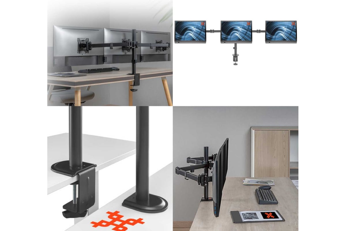 Настольный кронштейн-крепление для трех мониторов с горизонтальным расположением со струбциной UNITEKI FMT73B в черном цвете. Кронштейн UNITEKI FMT73B подходит для всех мониторов, диагональю от 17 до 27 дюймов (см.: 43 ~ 69) и весом до 7 кг.