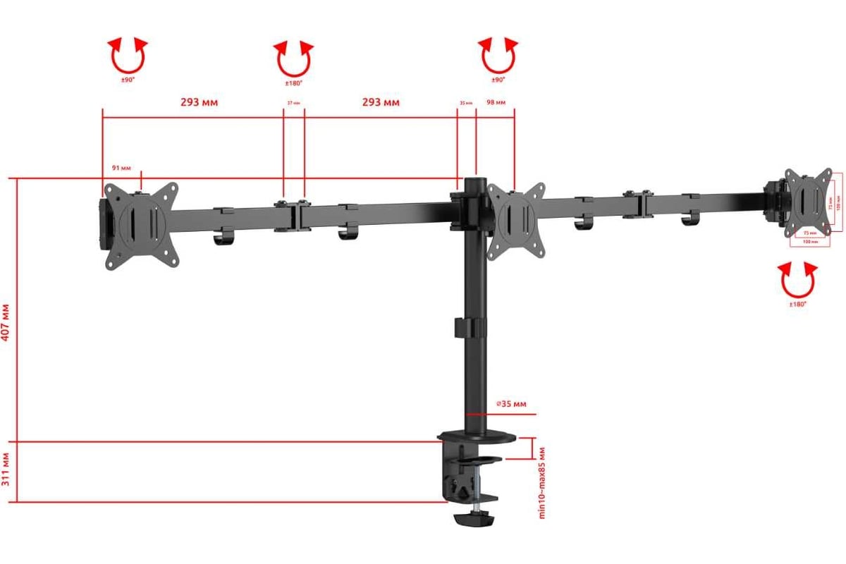 Тип кронштейна: Настольный со струбциной для трех мониторов с расположением в горизонтальной плоскости