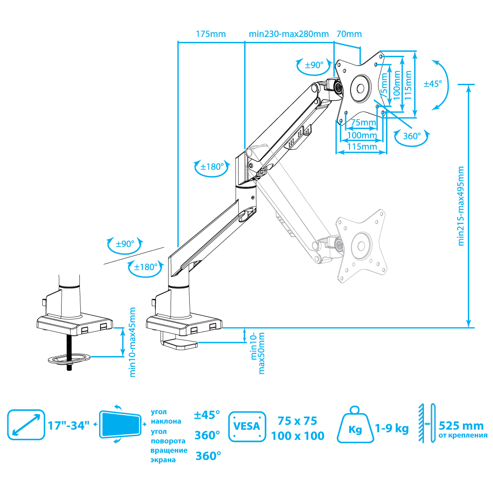 Вид кронштейна: Выдвижной, Наклонный, Поворотный, С перемещением по вертикали, положение панели портрет/альбом