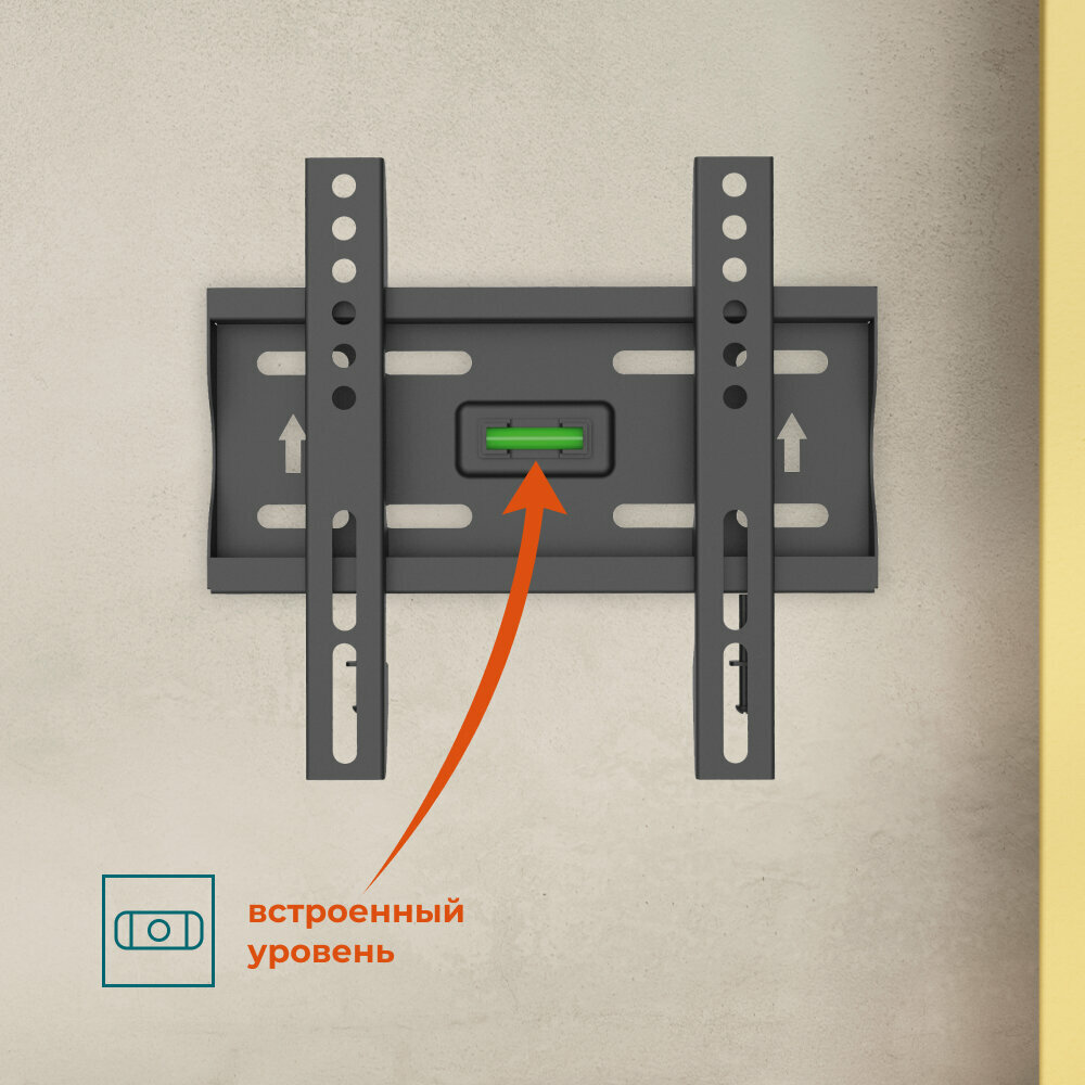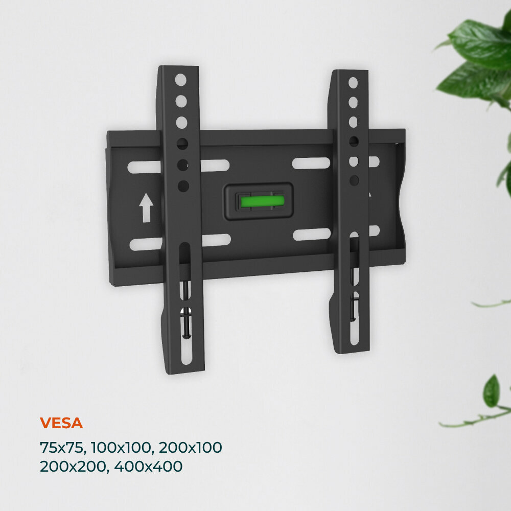 Кронштейн легко крепится на стену, подходит для самостоятельного монтажа и не требует специальных навыков для установки. Он универсален за счет предусмотренных размеров VESA: 75х75, 100х100, 200х100, 200х200. VESA — международный стандарт настенных креплений.