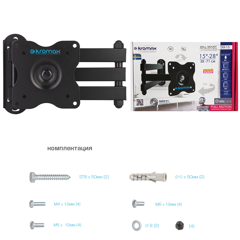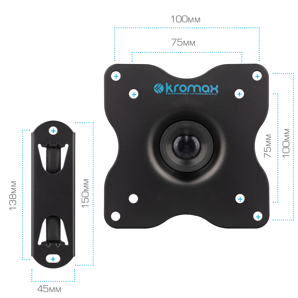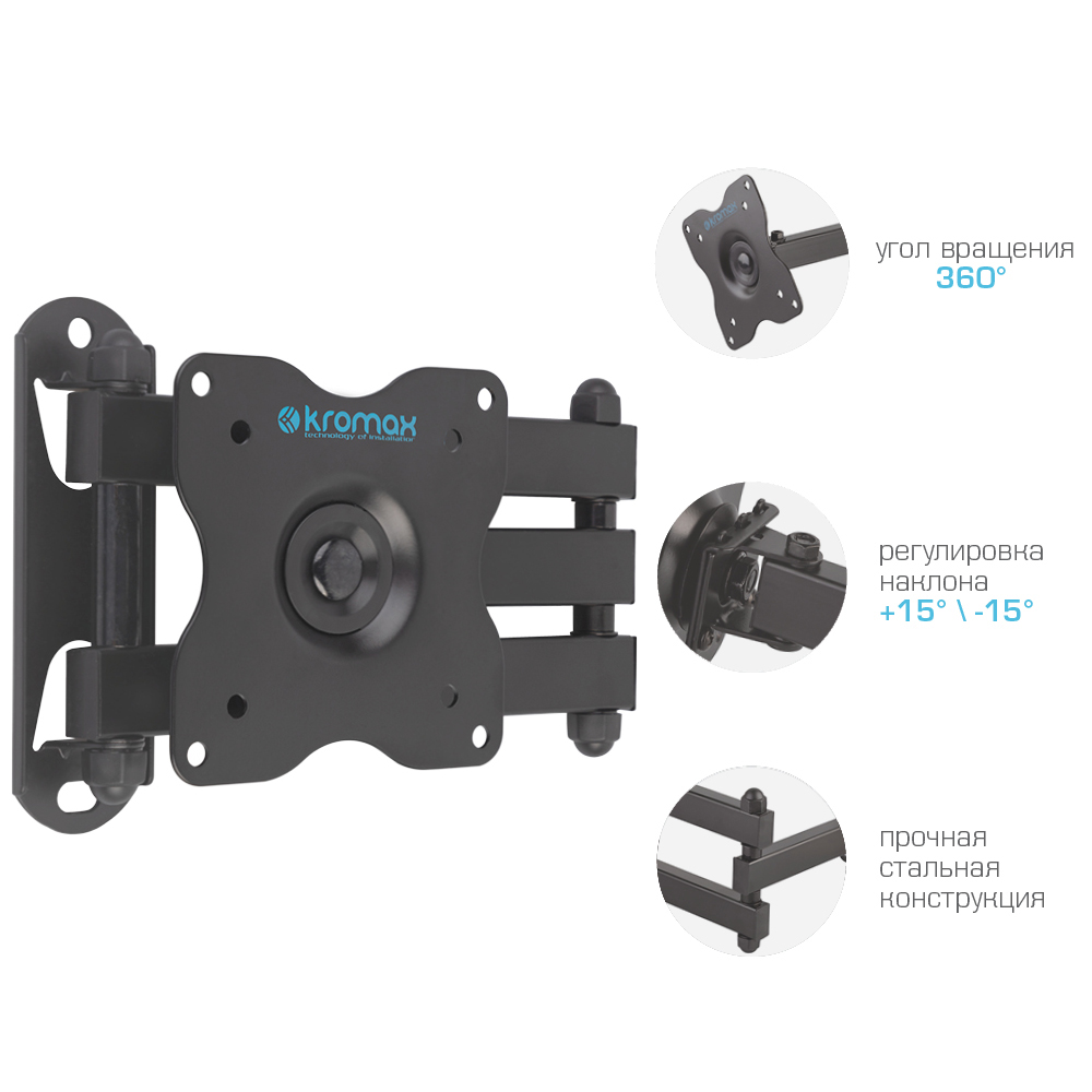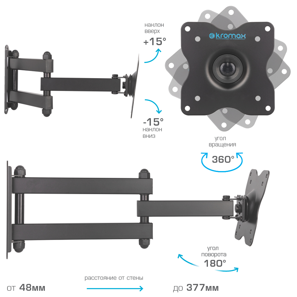 Надежная стальная конструкция, Максимальная степень подвижности, Минимальное расстояние до стены в сложенном виде 48 мм, 3D вращение экрана, Съемная монтажная пластина