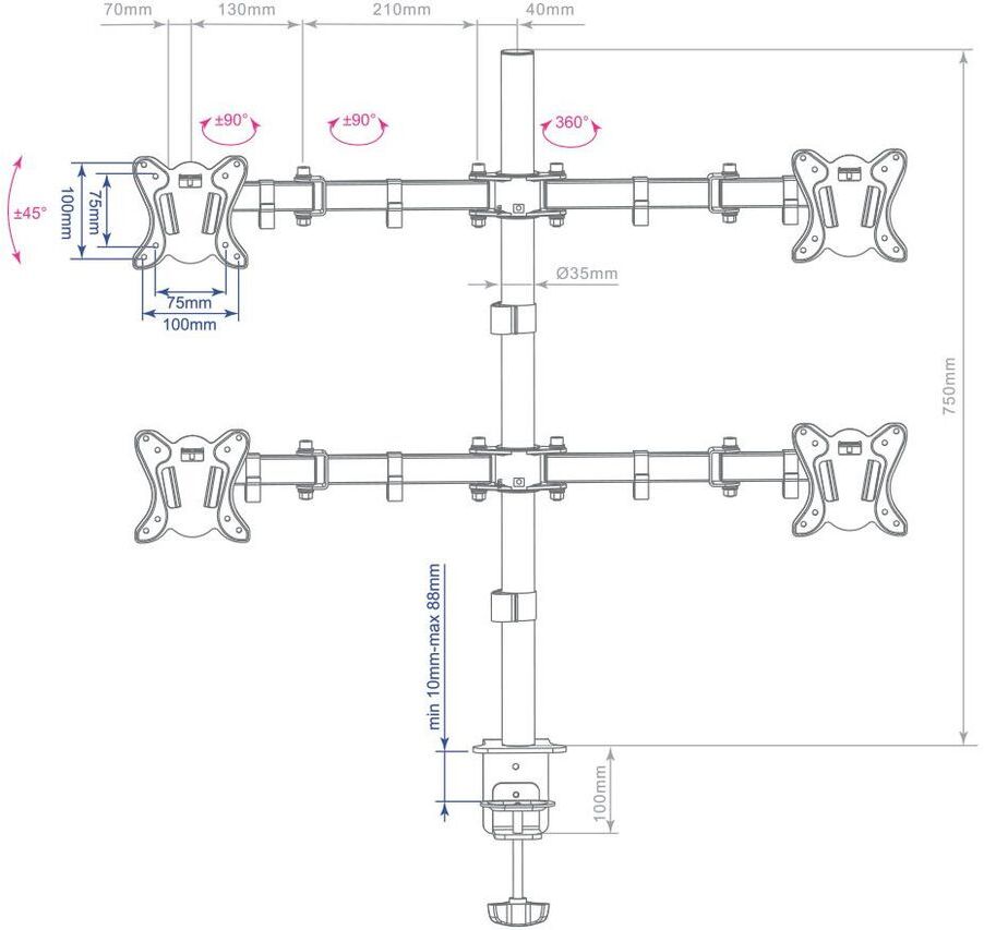 Особенности Максимальная нагрузка: 4×6 кг. Регулируемое по высоте крепление. Мощная стальная конструкция. Съемная монтажная пластина. Надёжное крепление к столу