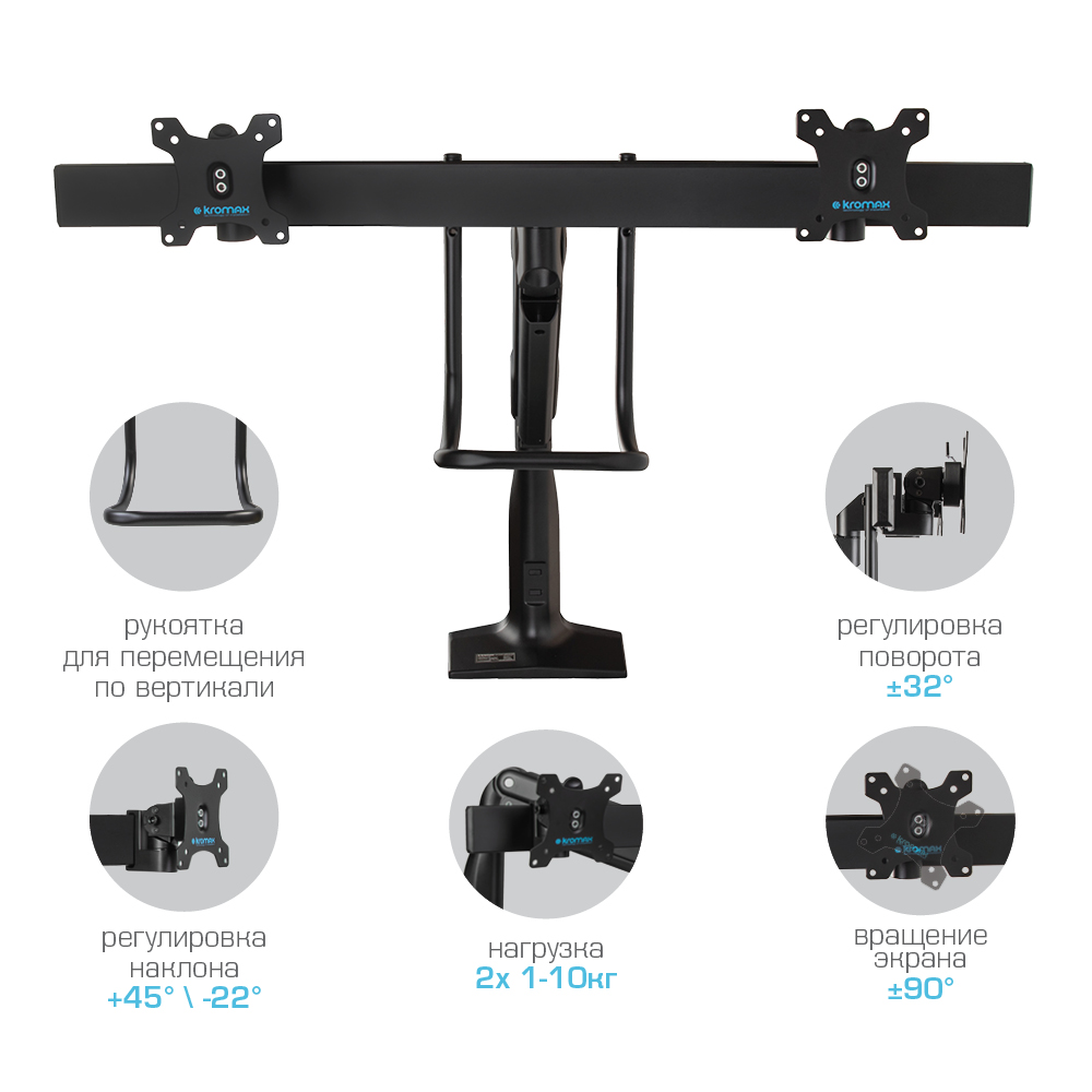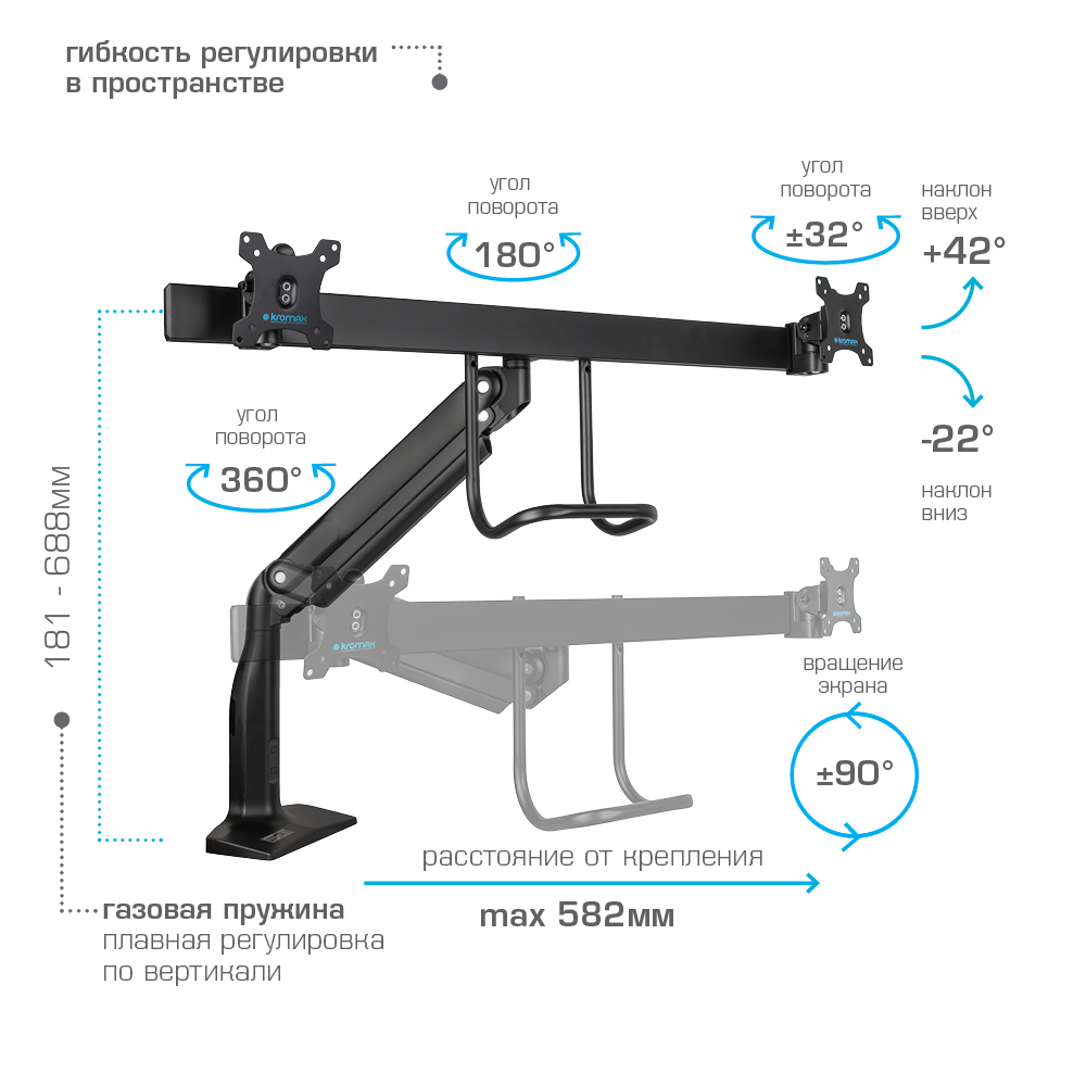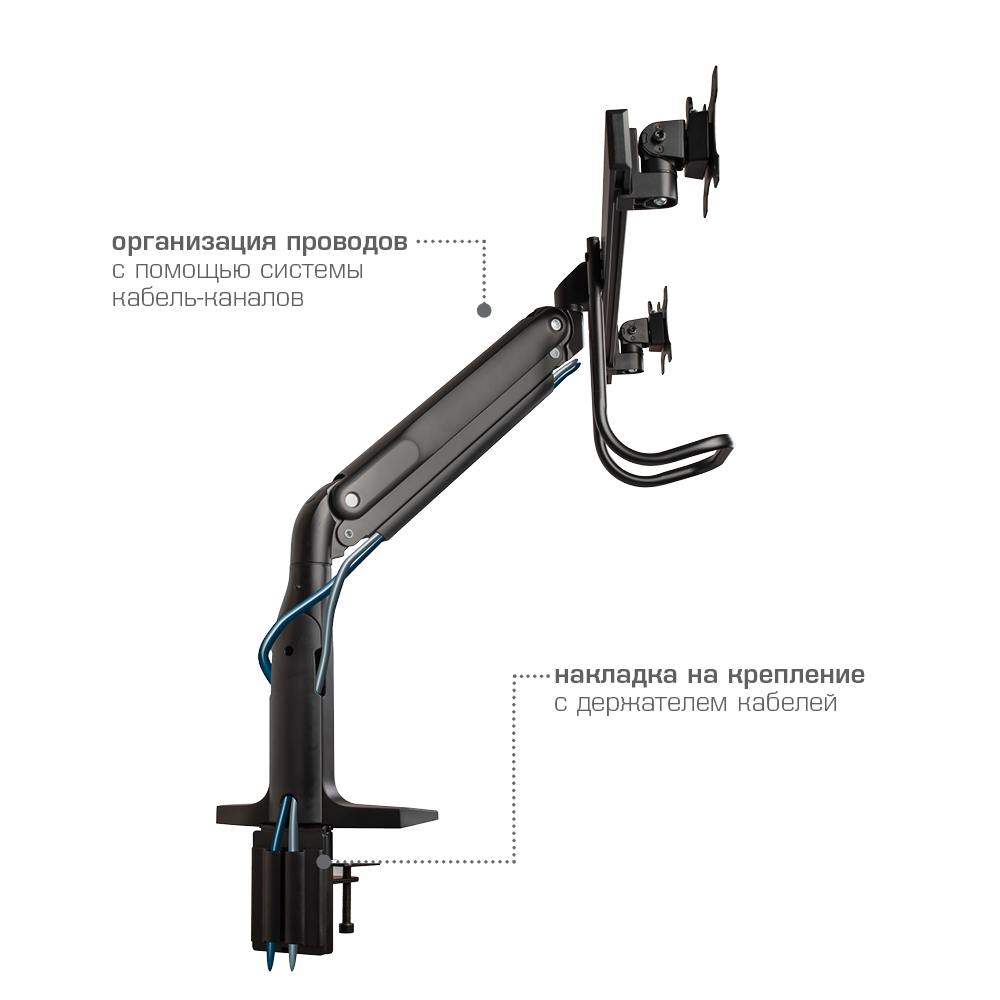 Надежная стальная конструкция, Многофункциональный – мониторы на кронштейне можно поворачивать вокруг совей оси на 360°, наклонять вверх и вниз, придвигать или удалять от себя, Регулируемое положение по высоте, максимальная высота 688 мм, Кабель-каналы для укладки соединительных кабелей