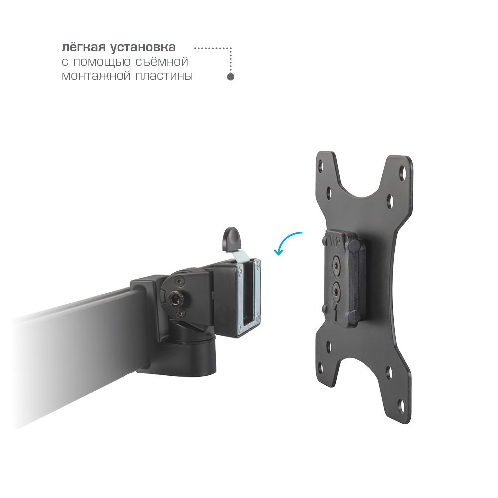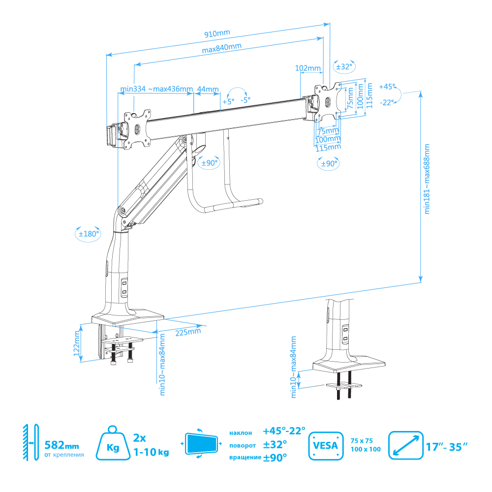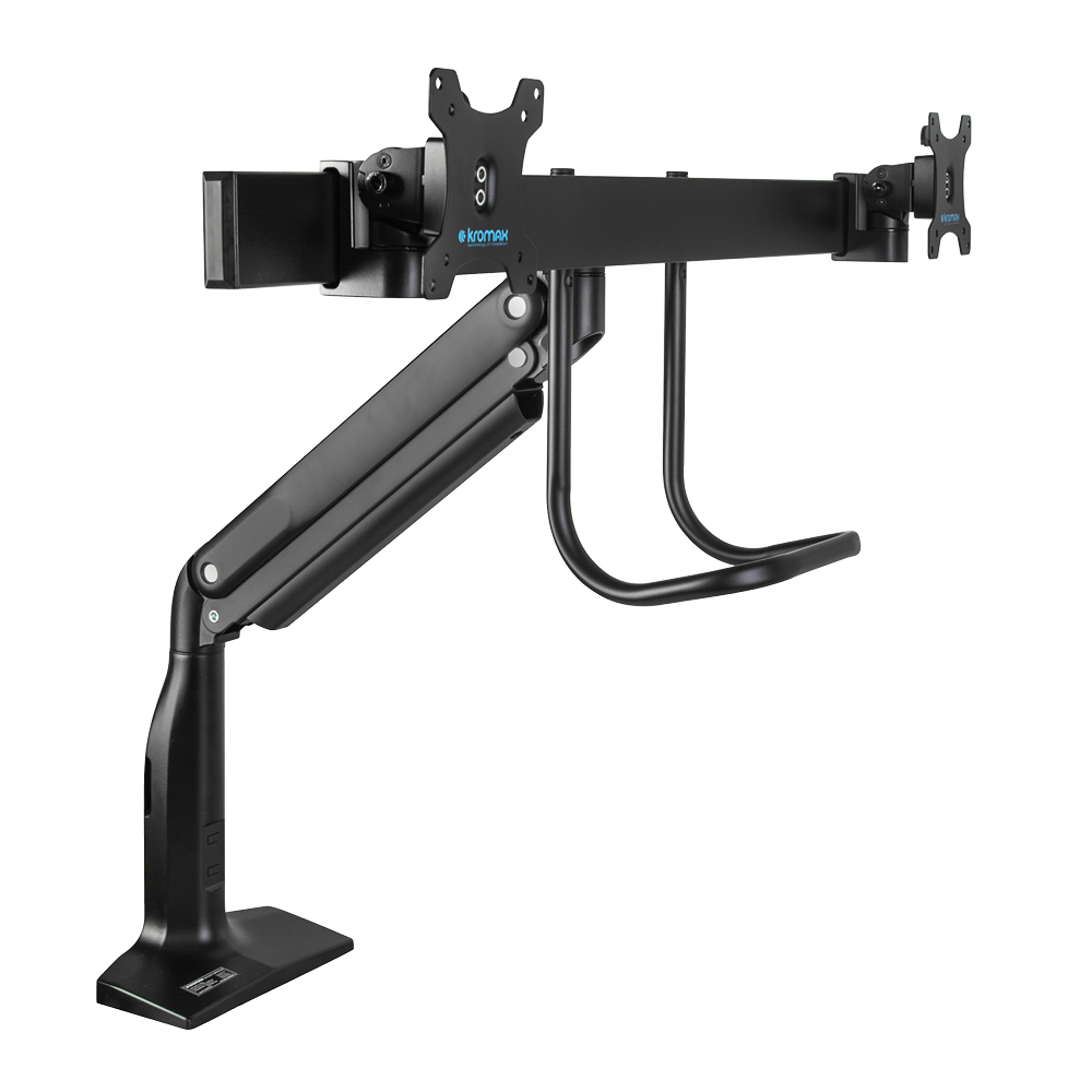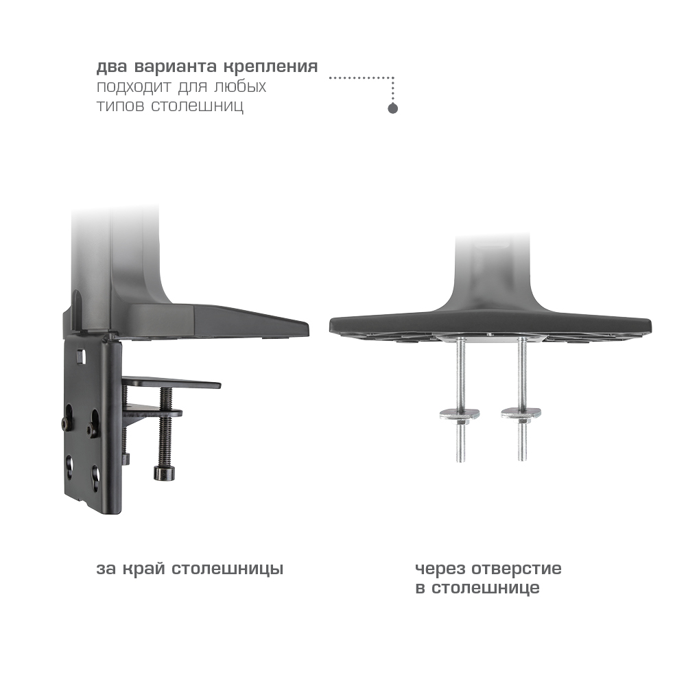 Надежная стальная конструкция, Многофункциональный – мониторы на кронштейне можно поворачивать вокруг совей оси на 360°, наклонять вверх и вниз, придвигать или удалять от себя, Регулируемое положение по высоте, максимальная высота 688 мм, Кабель-каналы для укладки соединительных кабелей
