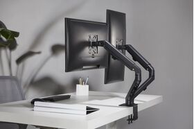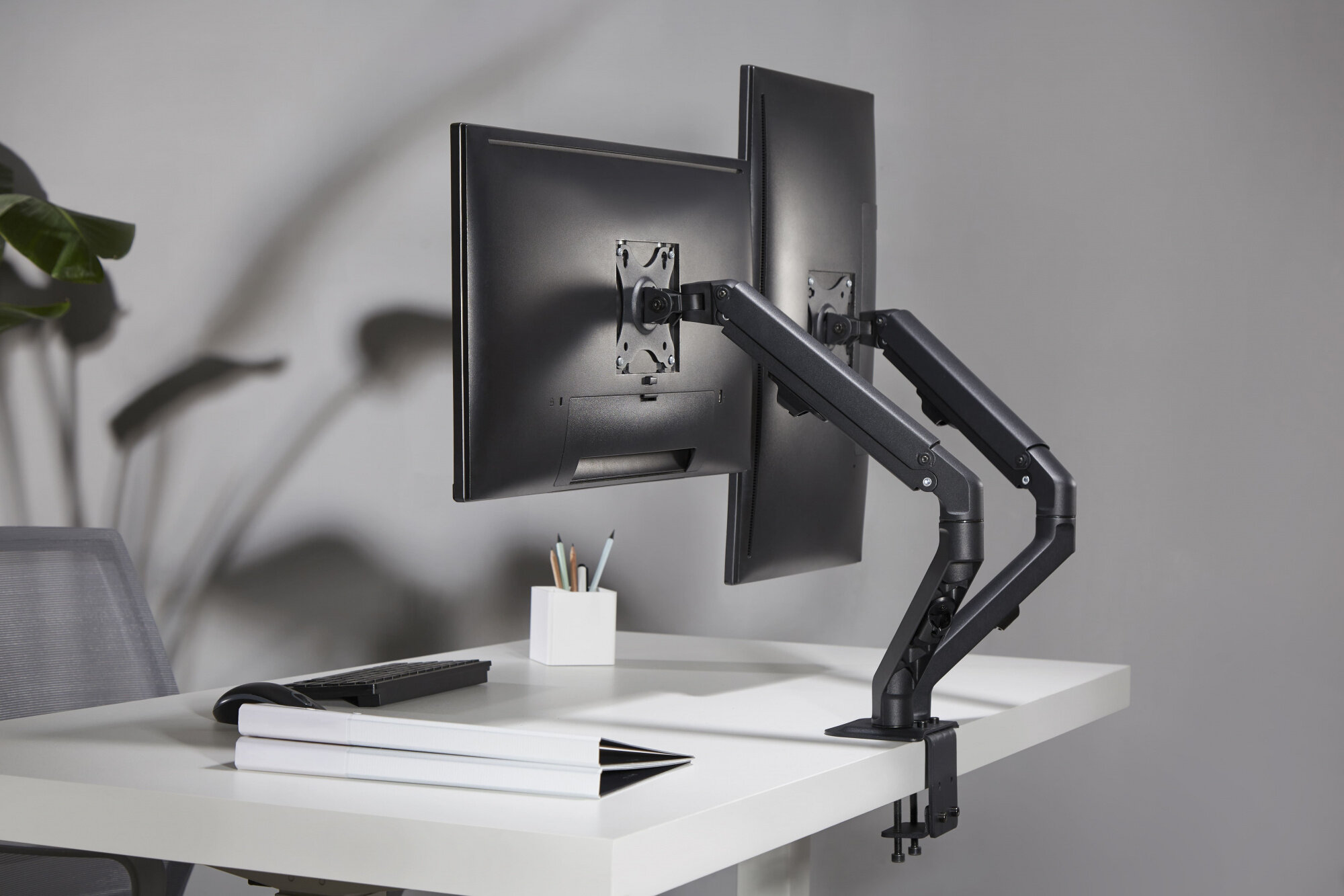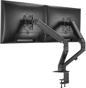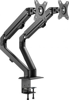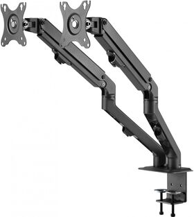 Настольный кронштейн с двумя креплениями под мониторы. Пружинный механизм позволяет легко перемещаться вверх и вниз.