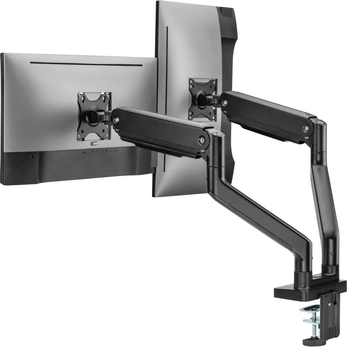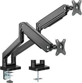 Настольный кронштейн с двумя креплениями под мониторы. Пружинный механизм позволяет легко перемещаться вверх и вниз.