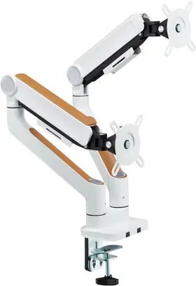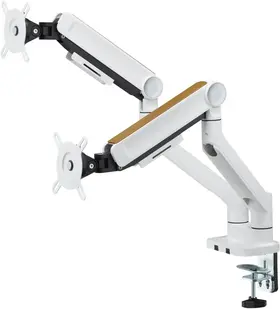 Настольный кронштейн для мониторов с системой газлифтов и встроенными пружинными механизмами для регулировки веса обеспечивает надежное крепление и позволяет изменять положение экранов по высоте и наклону.