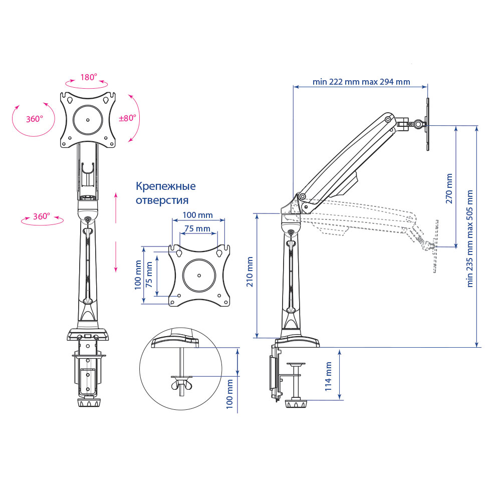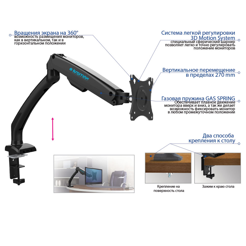 Описание: Газовая пружина GAS SPRING обеспечивает плавную регулировку положения монитора по высоте и его фиксацию в любом промежуточном положении. 2 варианта крепления к столу: к краю стола или на поверхность.