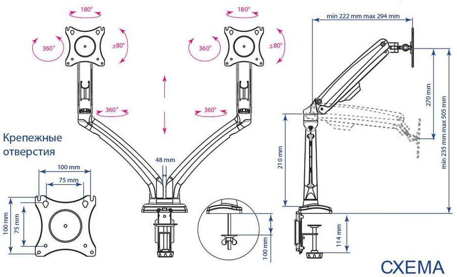 Описание Газовая пружина GAS SPRING обеспечивает плавную регулировку положения монитора по высоте и его фиксацию в любом промежуточном положении. 2 варианта крепления к столу: к краю стола или на поверхность.