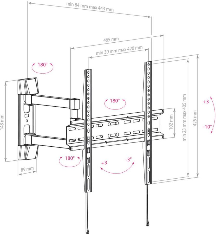 Описание Кронштейн LCD-414, для LED/LCD телевизоров 26"-55", max 35 кг, настенный, наклон +3 -10, поворот 180 градусов, от стены 84-443 мм, max VESA 400×400 мм