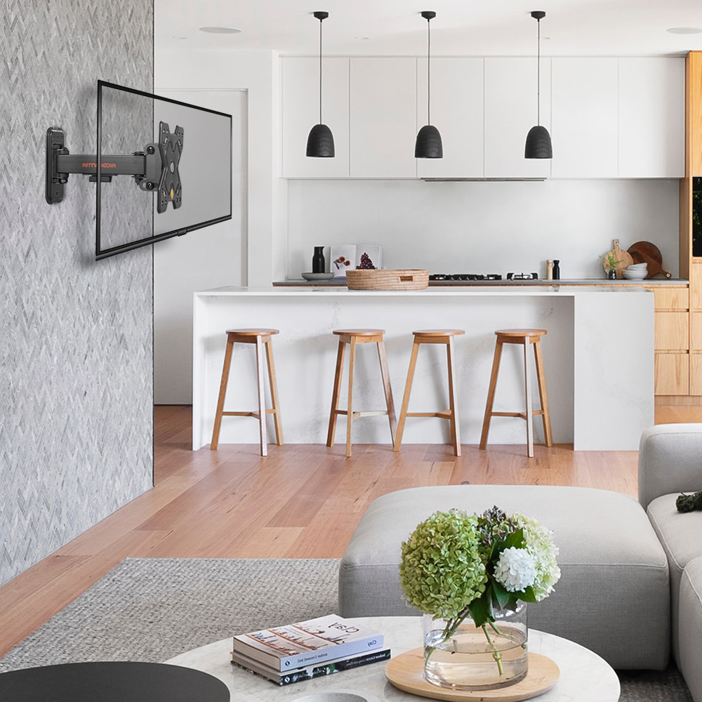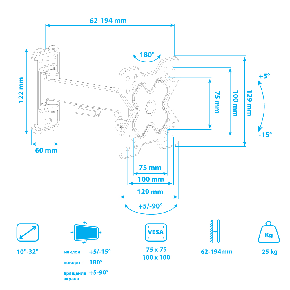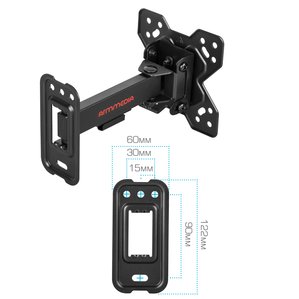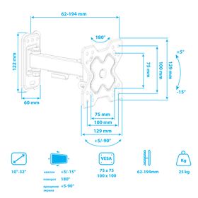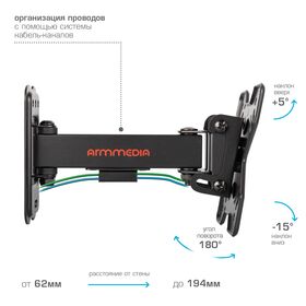 Надежная стальная конструкция, Универсальный - телевизор на кронштейне можно наклонить, повернуть и сдвинуть к стене, Легкий монтаж телевизора - благодаря наличию съемной монтажной пластины, Кабель-канал, Вращение экрана +5° -90°