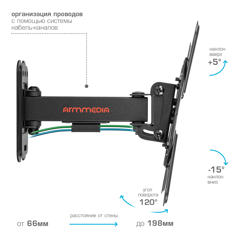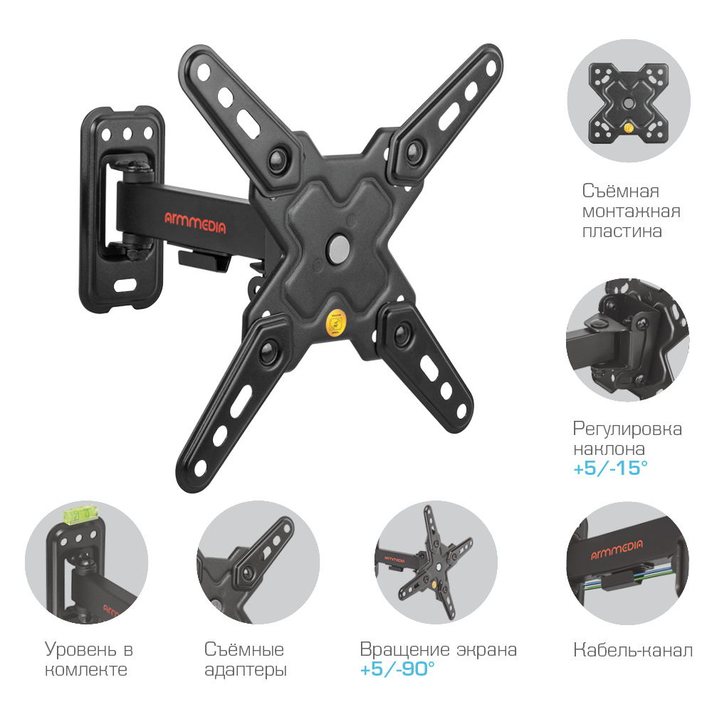 Надежная стальная конструкция, Универсальный - телевизор на кронштейне можно наклонить, повернуть и сдвинуть к стене, Легкий монтаж телевизора - благодаря наличию съемной монтажной пластины, Кабель-канал, Вращение экрана +5° -90°