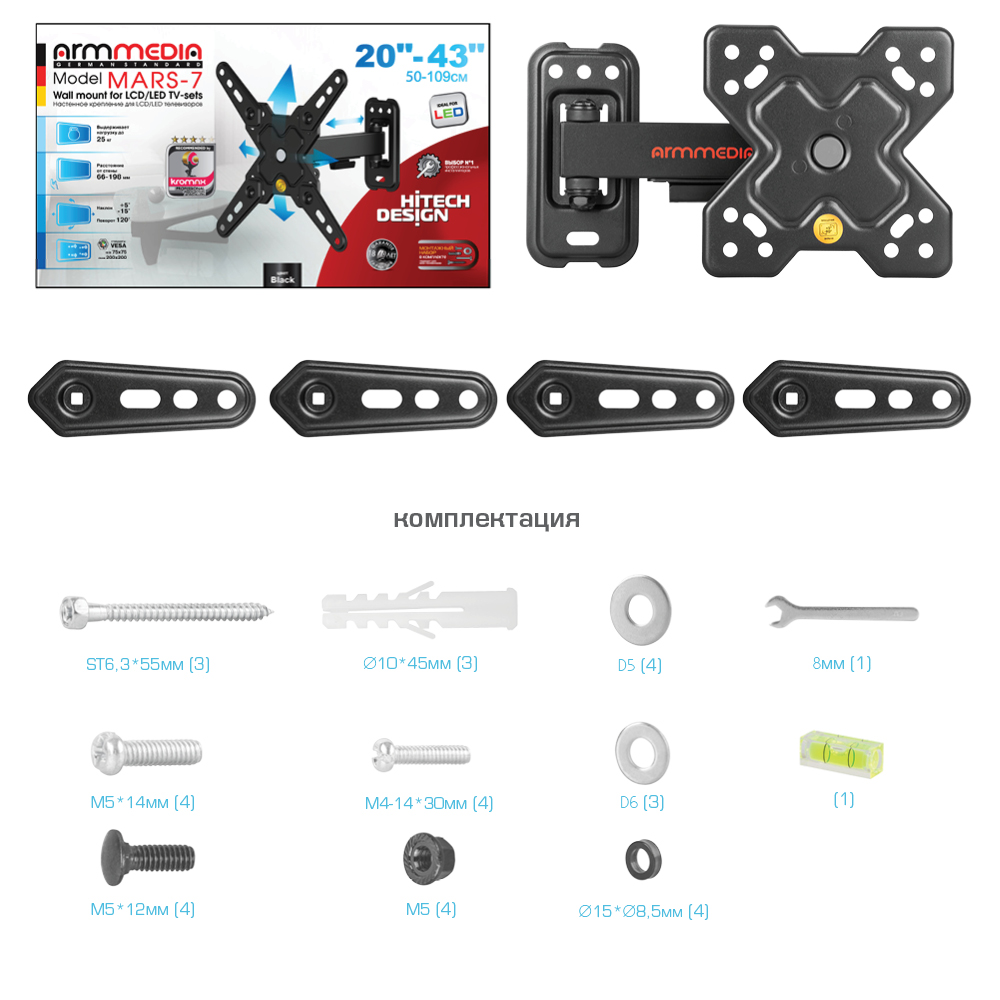 Кронштейн для телевизора, комплект ключей и крепежа для установки ТВ, навесной уровень, подробная инструкция на русском языке