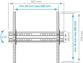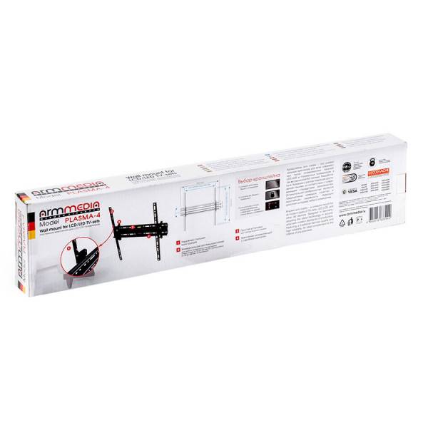 Описание: Наклонный кронштейн для телевизоров с диагональю 22-65 дюймов, с углом наклона +15° -15° весом до 55 кг. Расстояние от стены — 74 мм. Max VESA 400*400.