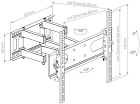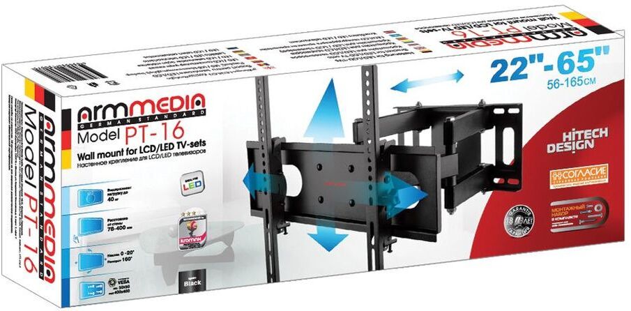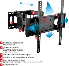 Особенности: Надежная стальная конструкция. Втроенный водяной уровень. Универсальная система крепления. Вращение экрана относительно стены ±5 . Защита от падения.