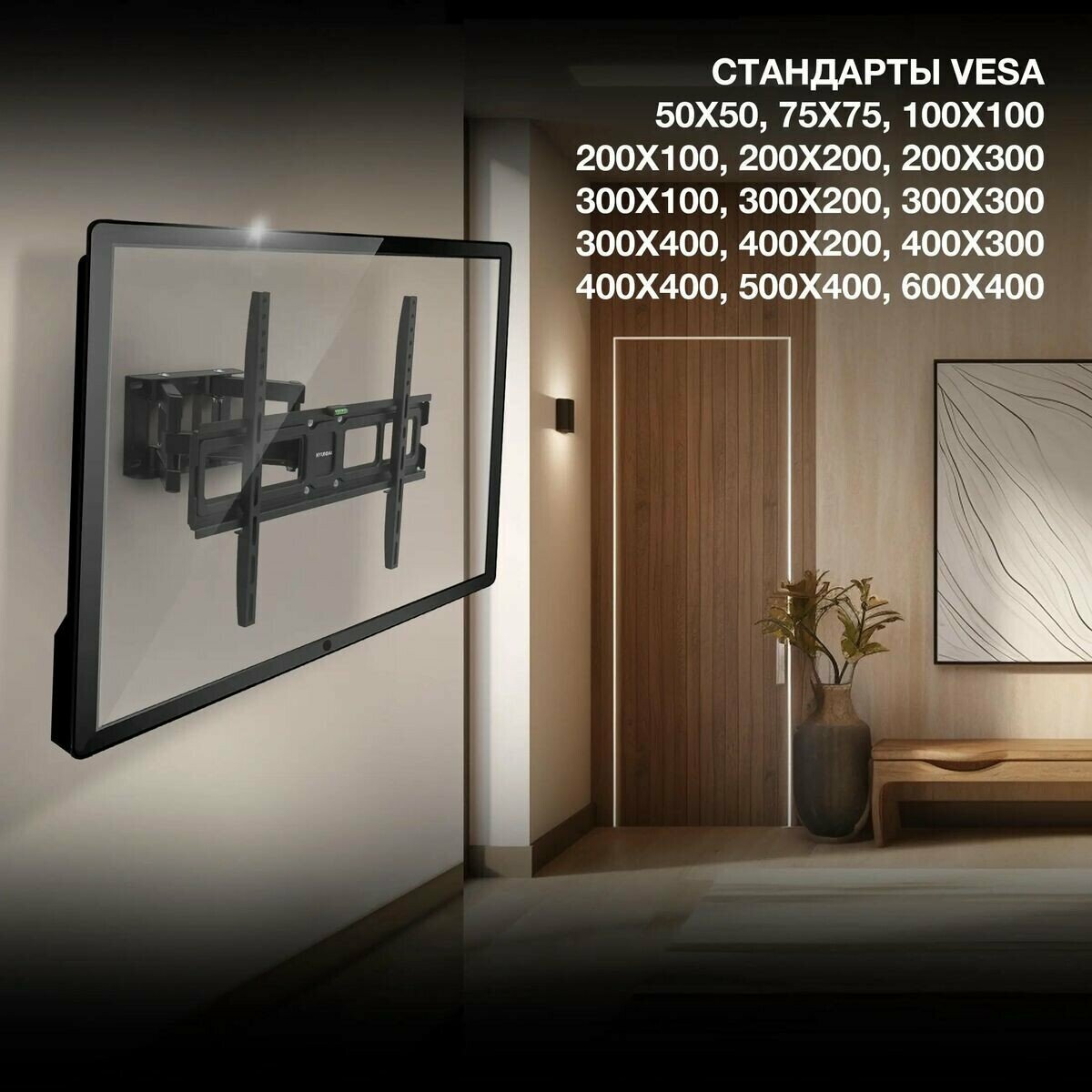 Стандарт Vesa: 50х50 мм, 75х75 мм, 100х100 мм, 100х200 мм, 200х100 мм, 200х200 мм, 200х300 мм, 300х100 мм, 300х200 мм, 400х200 мм, 300х400 мм, 400х300 мм, 400х400 мм, 500х400 мм, 600х400 мм;