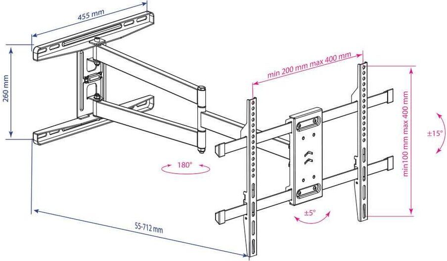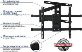 Описание Легкий монтаж при помощи съемной монтажной пластины. Мощная стальная конструкция. Универсальный телевизор на кронштейне можно наклонить, повернуть и сдвинуть к стене. Максимальный вылет от стены 712 мм. Корректировка экрана уникальная возможность вращения экрана на ±5° относительно стены.