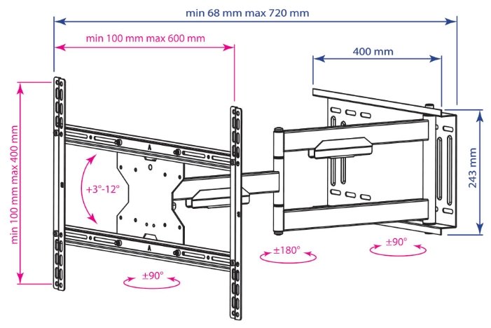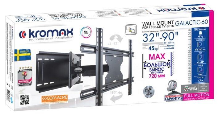 Описание Сверх мощный кронштейн KROMAX GALACTIC-60 предназначен для надежного крепления к стене OLED/LED/LCD/плазменных телевизоров с диагональю экрана от 32 до 90 дюймов (81-229см).