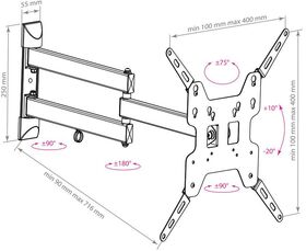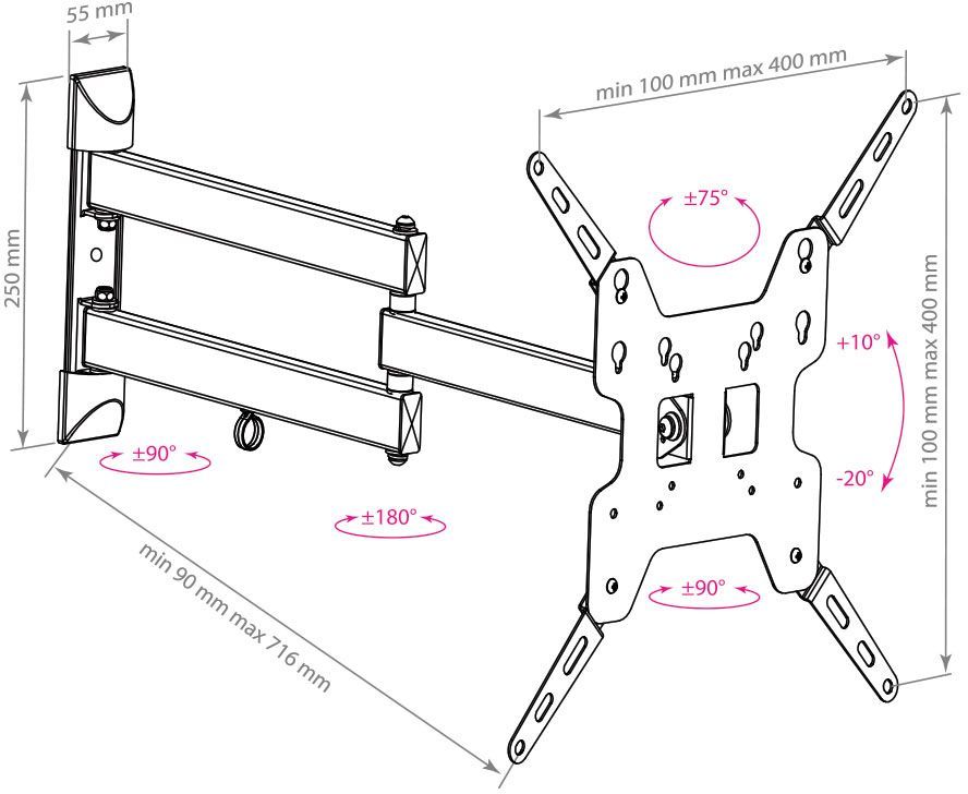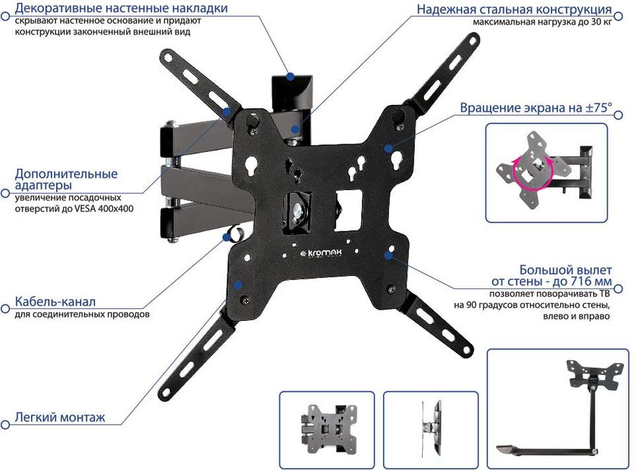 Особенности Вращение экрана на ±75 градусов, легкий монтаж, декоративные настенные накладки скрывают настенное основание и придают конструкции законченный внешний вид.