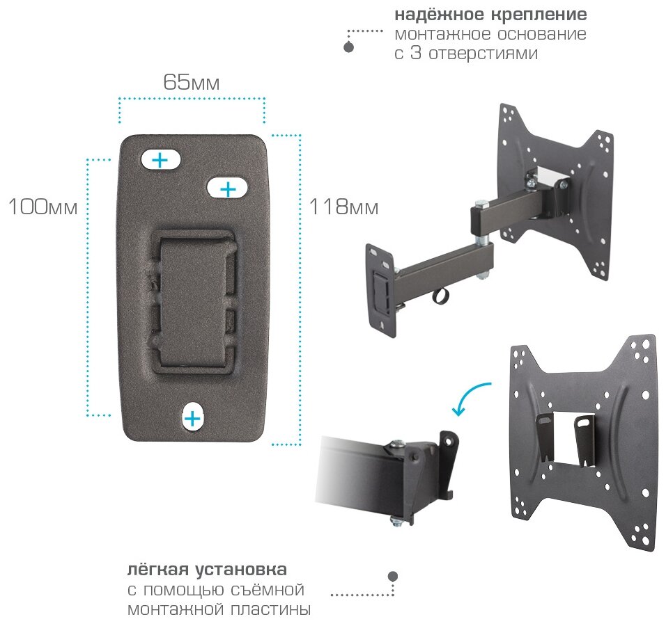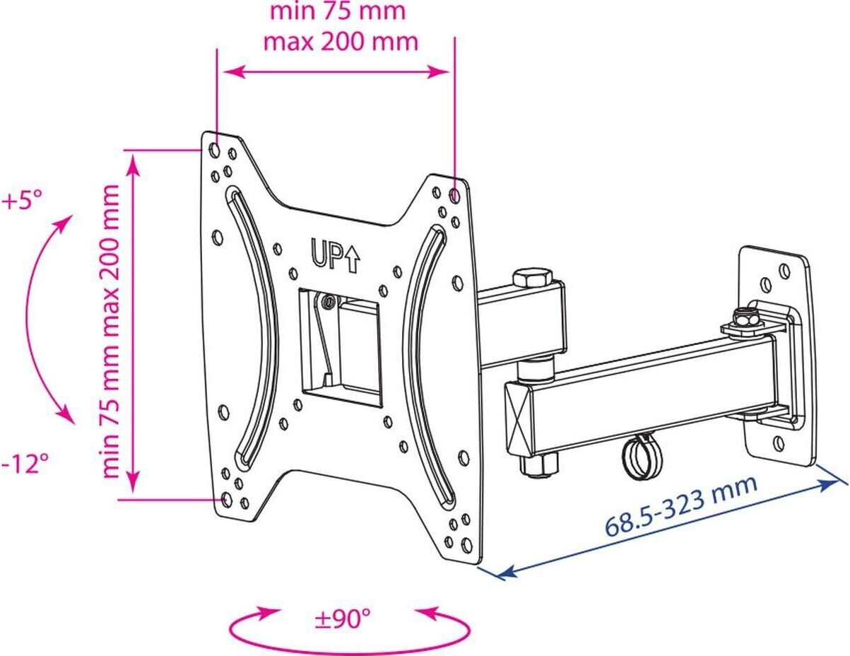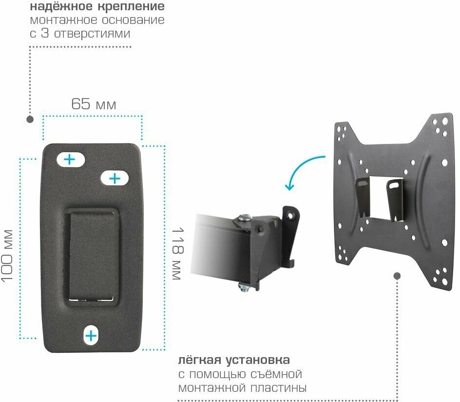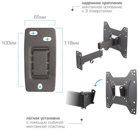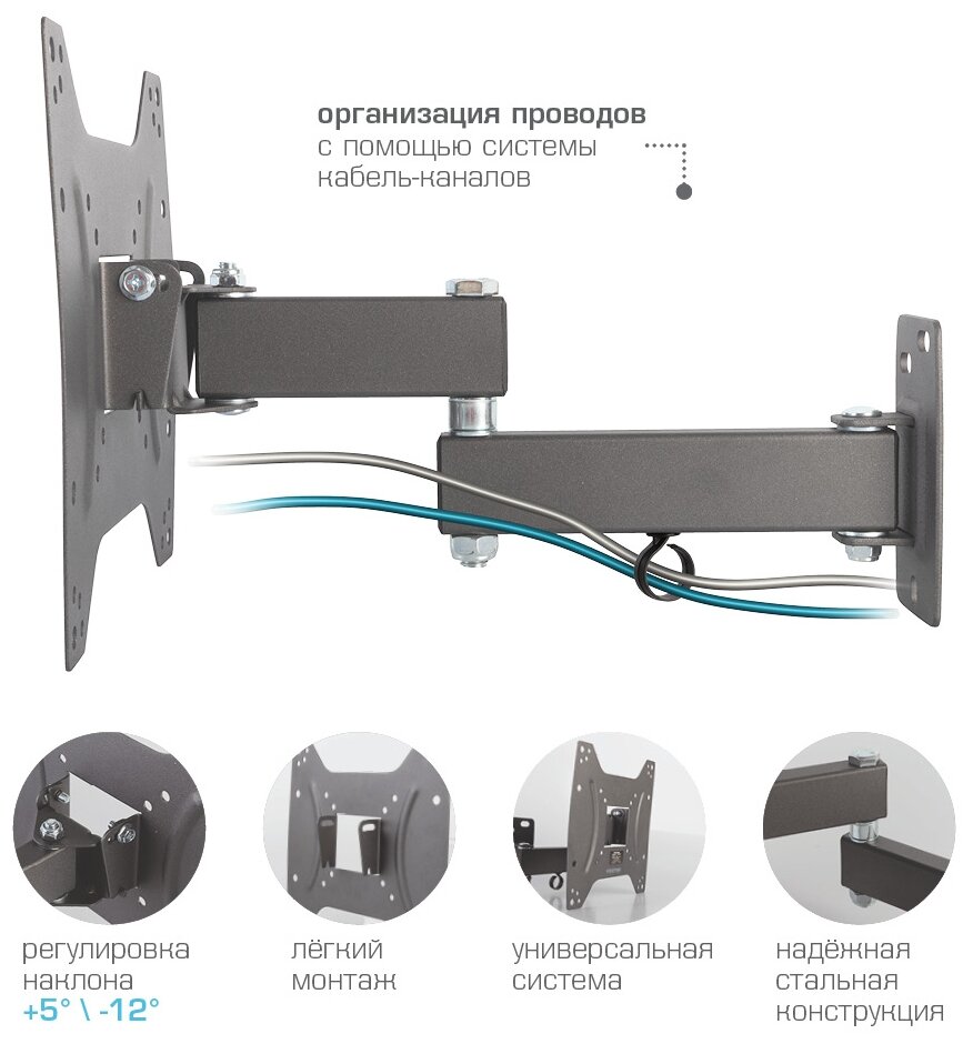 Система шарниров дает возможность регулировать положение экрана телевизора от 5 до 12 градусов, что позволяет оптимизируя пространство помещения добиваться наиболее удобного расположения экрана для просмотра. В комплекте поставки крепления есть вся необходимая фурнитура для монтажа. Кронштейн имеет кабель-канал. Поддерживаемые стандарты VESA: 75 х 75, 100 x 100, 200 x 100, 200 x 200.