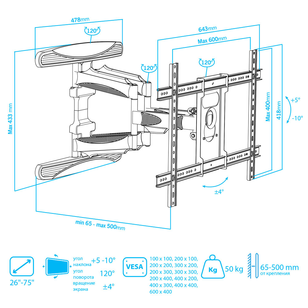 Вид кронштейна: Выдвижной, Наклонный, Поворотный