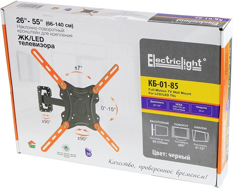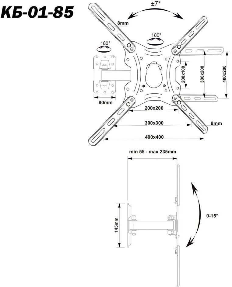 поворот: ±90°; регулировка наклона: 0°-15°; корректировка экрана по горизонтали: ±7°; минимальное расстояние от стены: 55мм; максимальное расстояние от стены: 235мм; Game Zona
