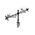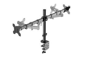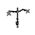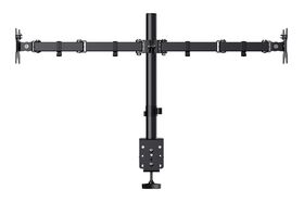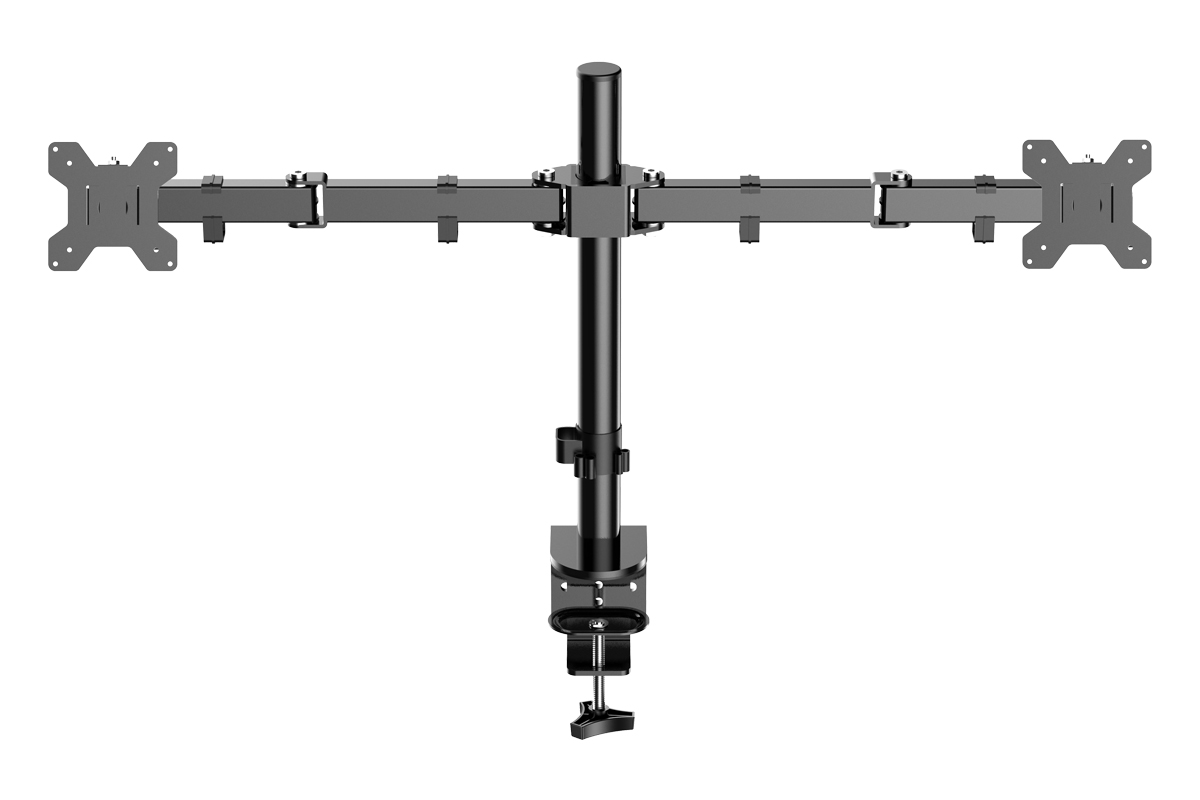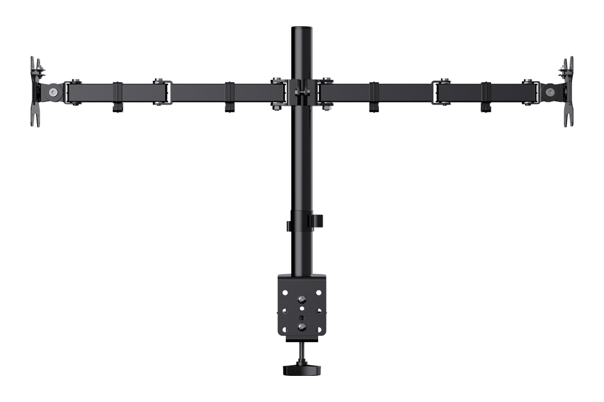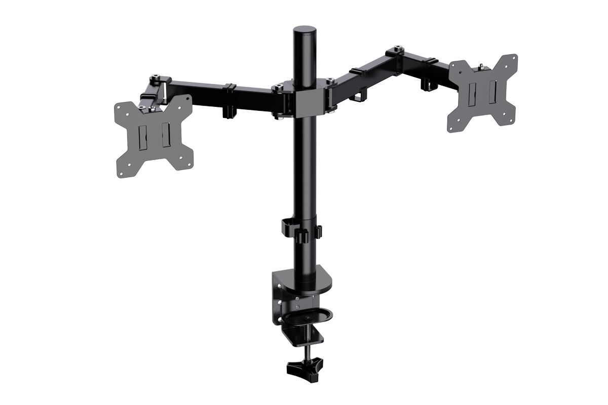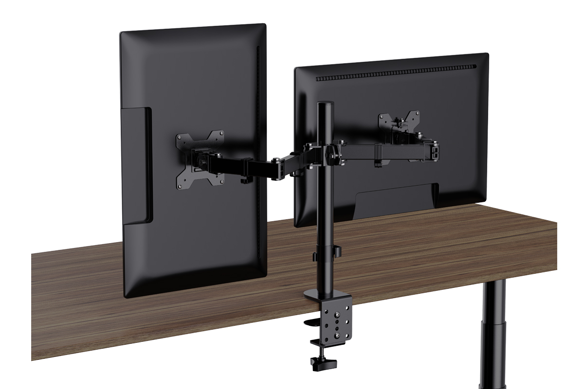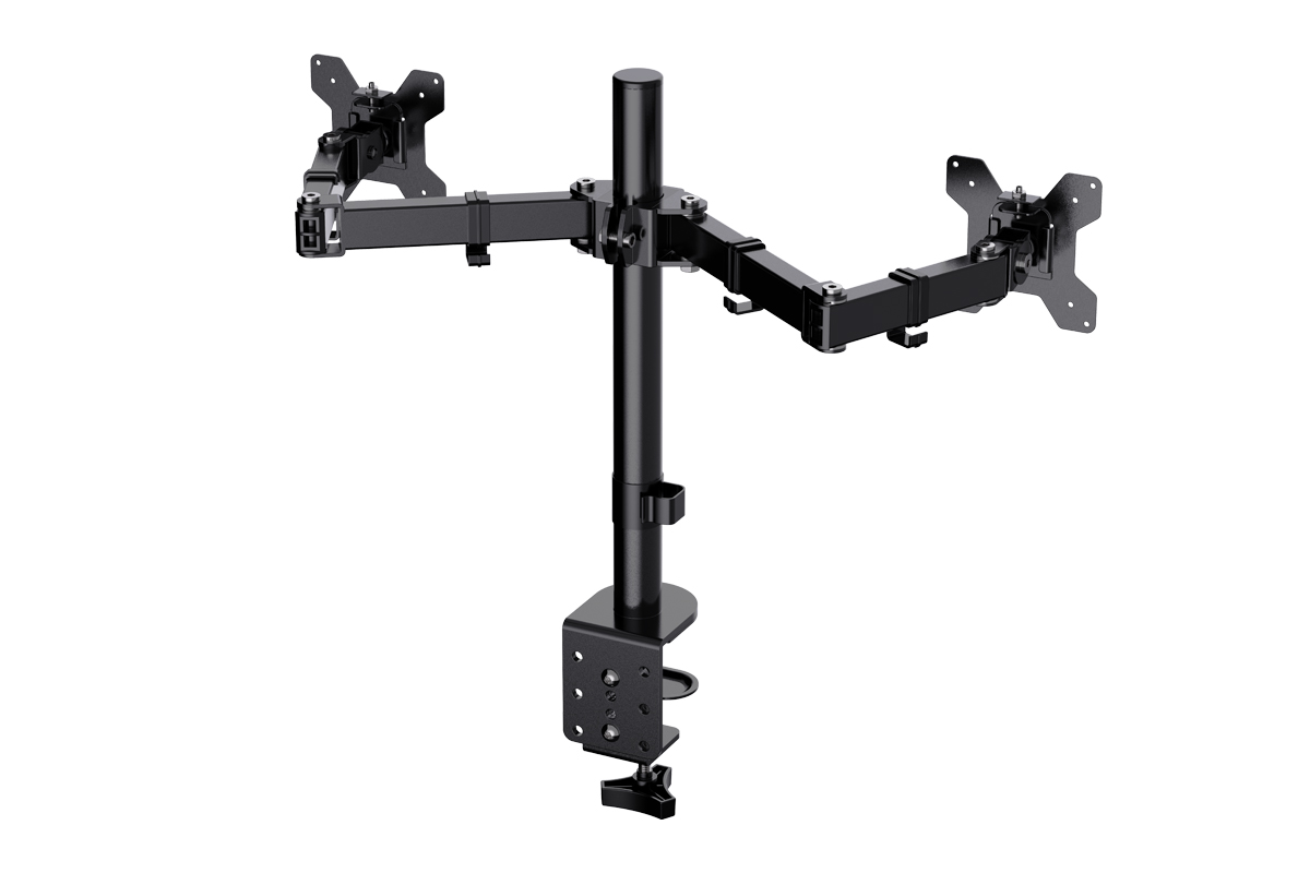 Двойной настольный кронштейн выручит в исключительных ситуациях – когда вам нужно установить на одно рабочее место одновременно два монитора или телевизора. Положение каждого из дисплеев гибко регулируется в индивидуальном порядке. В частности меняются: угол наклона по вертикали (±90°) и по горизонтали (все 360°), угол поворота, а также длина выноса. Плюс, можно изменить высоту подъёма, но уже одновременно для обоих экранов. Установка выполняется на столешницы с отверстием и без.