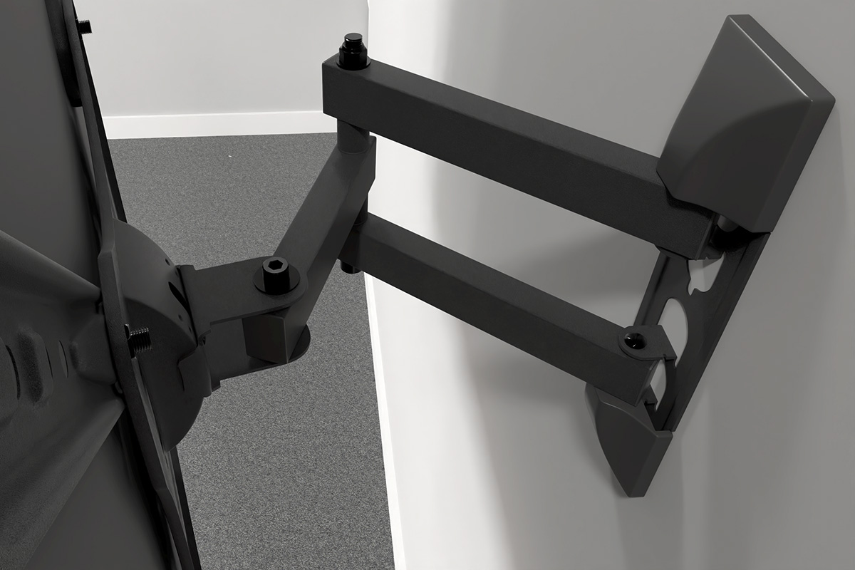 Крепление конструктивно разделено на две основные части (одна монтируется на стену, вторая – на телевизор), что существенно облегчает работы по монтажу (процедуру может выполнить даже непрофессионал). Все необходимые крепежные элементы уже входят в комплект поставки (винты, дюбели, шайбы, уровень и т.п.).