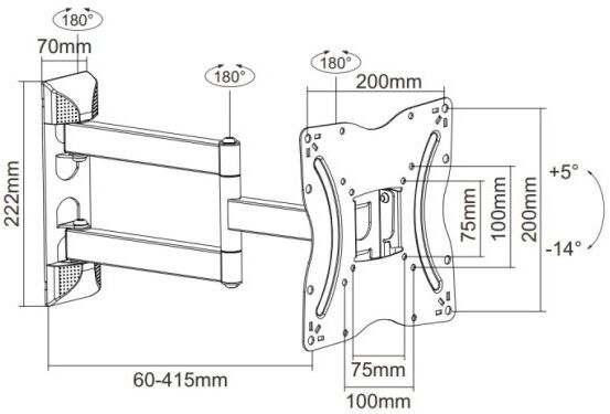 | | Углы и размеры | | Угол наклона вверх | 14 ° | | Угол наклона вниз | 5 ° | | Угол поворота | 180 ° | | Крепление VESA | 75x75 мм 100x100 мм 200x100 мм 200x200 мм