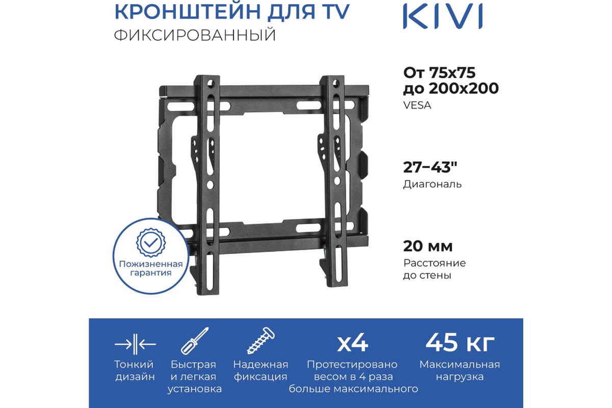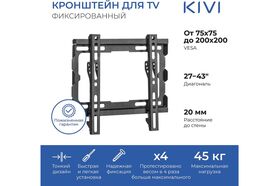 Кронштейн KIVI Basic-22F гарантирует вам не только безопасное крепление, но и стильный вид вашего телевизора. Прочные элементы крепления выдерживают интенсивное использование. Кронштейн подойдет для телевизоров с диагональю от 23 до 43 дюймов и весом до 45 килограммов.