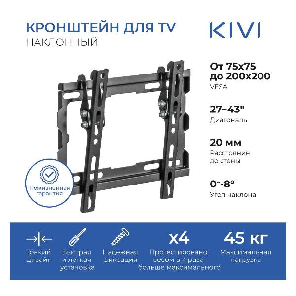 Кронштейн наклонного типа Kivi Basic-22T предназначен для телевизоров с диагональю 23-43 дюйма, что делает изделие универсальным для большинства устройств. Благодаря прочной конструкции модель обеспечивает прочное и безопасное крепление на стену. За счет близкой фиксации кронштейна к стене создается эффект «плоского» экрана, это максимально оптимизирует использование пространства. Крепежные элементы поставляются в комплекте, что позволяет без проблем произвести монтаж кронштейна. Изделие изготовлено из высокопрочного металла, который устойчив к образованию коррозии.