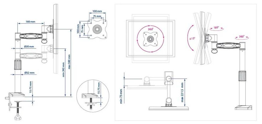 Дополнительная информация: крепление к краю стола или на поверхность, регулировка положения монитора по высоте (242-390 мм)