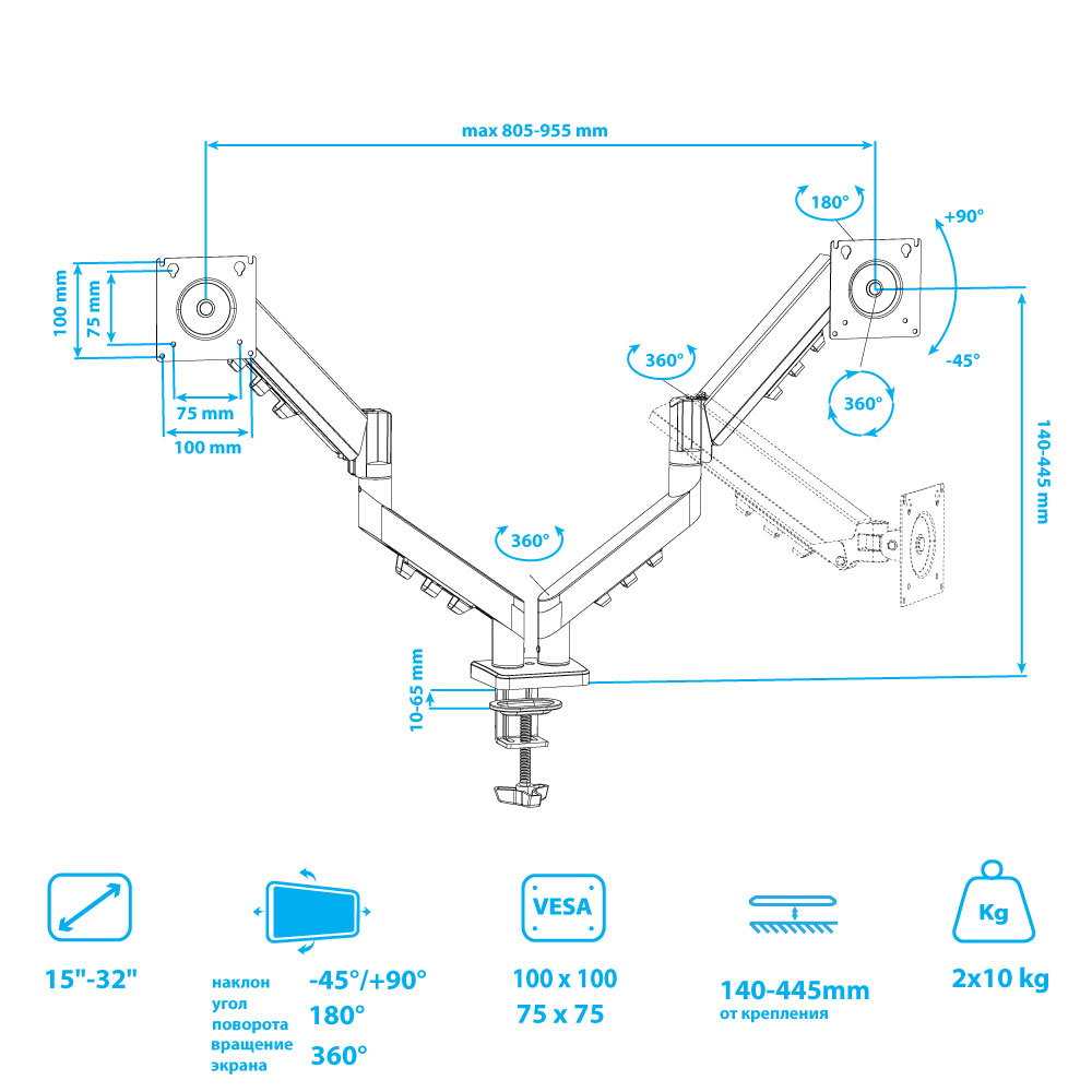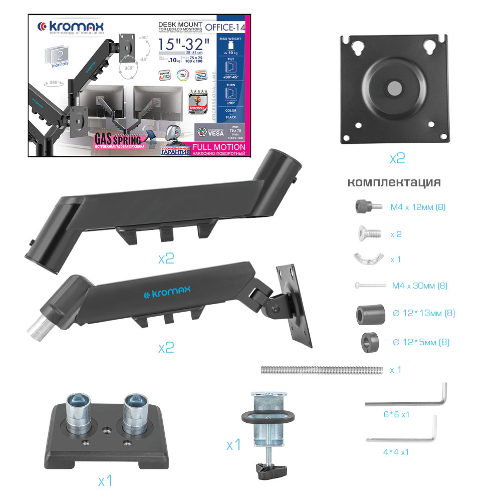 Вращение экрана на 360° возможность размещения монитора, как в вертикальном, так и в горизонтальном положении, Система легкой регулировки 3D Motion System специальный сферический шарнир позволяет легко и точно регулировать положение монитора, Регулируемое по высоте крепление позволит установить монитор на нужной высоте, 2 способа крепления к столу, Газовая пружина GAS SPRING Обеспечивает плавное движение монитора вверх и вниз, а так же делает возможность фиксировать монитор в любом промежуточном положении