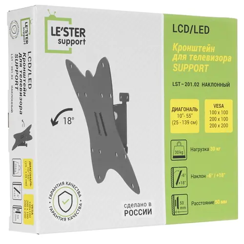 Кронштейн для телевизора - это стильный кронштейн для одного телевизора. Он подходит для большинства телевизоров весом до 25 кг с диагональю от 10 до 50 дюймов, поддерживающих VESA 200х100, 100x100 и 75х75. Прочная конструкция из Российской стали ГОСТ надежно удерживает ваш телевизор, а стильный окрас порошковой краской идеально впишется в любой интерьер и будет сохранять свои свойства долгое время. Регулируйте наклон телевизора от -6 до +15° без использования инструмента.