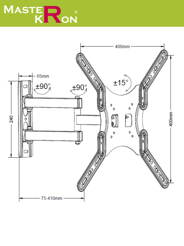 Поворотный кронштейн VESA 400x400 и максимальной нагрузкой до 30 кг. Простой и функциональный. В сложенном состоянии - 70 мм от стены, а для поворота телевизора может раскладываться на расстояние 410 мм.